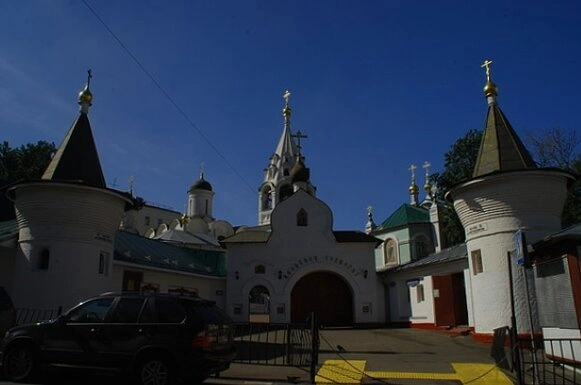 Белые стены храма и зелёные кровли, запечатлённые на снимке, создают ощущение благолепия и духовной чистоты. Фотография передаёт спокойную и умиротворённую атмосферу этого святого места, расположенного в самом сердце шумного мегаполиса, но сохранившего дух молитвенного предстояния и древних монашеских традиций.