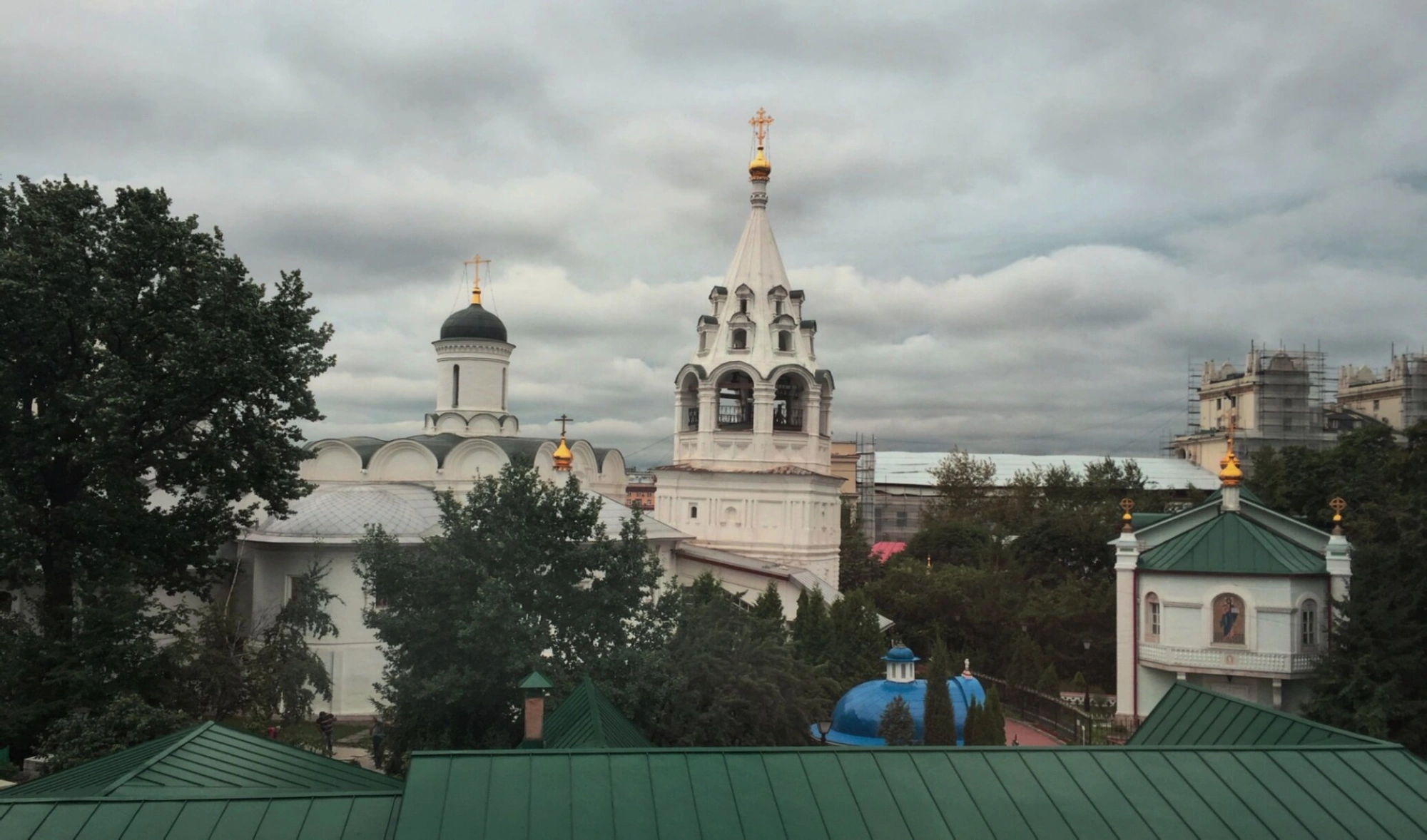 На фотографии запечатлён храм великомученика Никиты на Швивой горке за Яузой — один из древнейших православных храмов Москвы и подворье Афонского Свято-Пантелеимонова монастыря. Архитектурный ансамбль, изображённый на снимке, включает основное здание храма с тёмным куполом, высокую шатровую колокольню с золотой главкой, а также окружающие их белоснежные стены и здания подворья, утопающие в зелени деревьев. Спокойный и строгий вид комплекса под пасмурным небом отражает особую молитвенную атмосферу этого святого места.