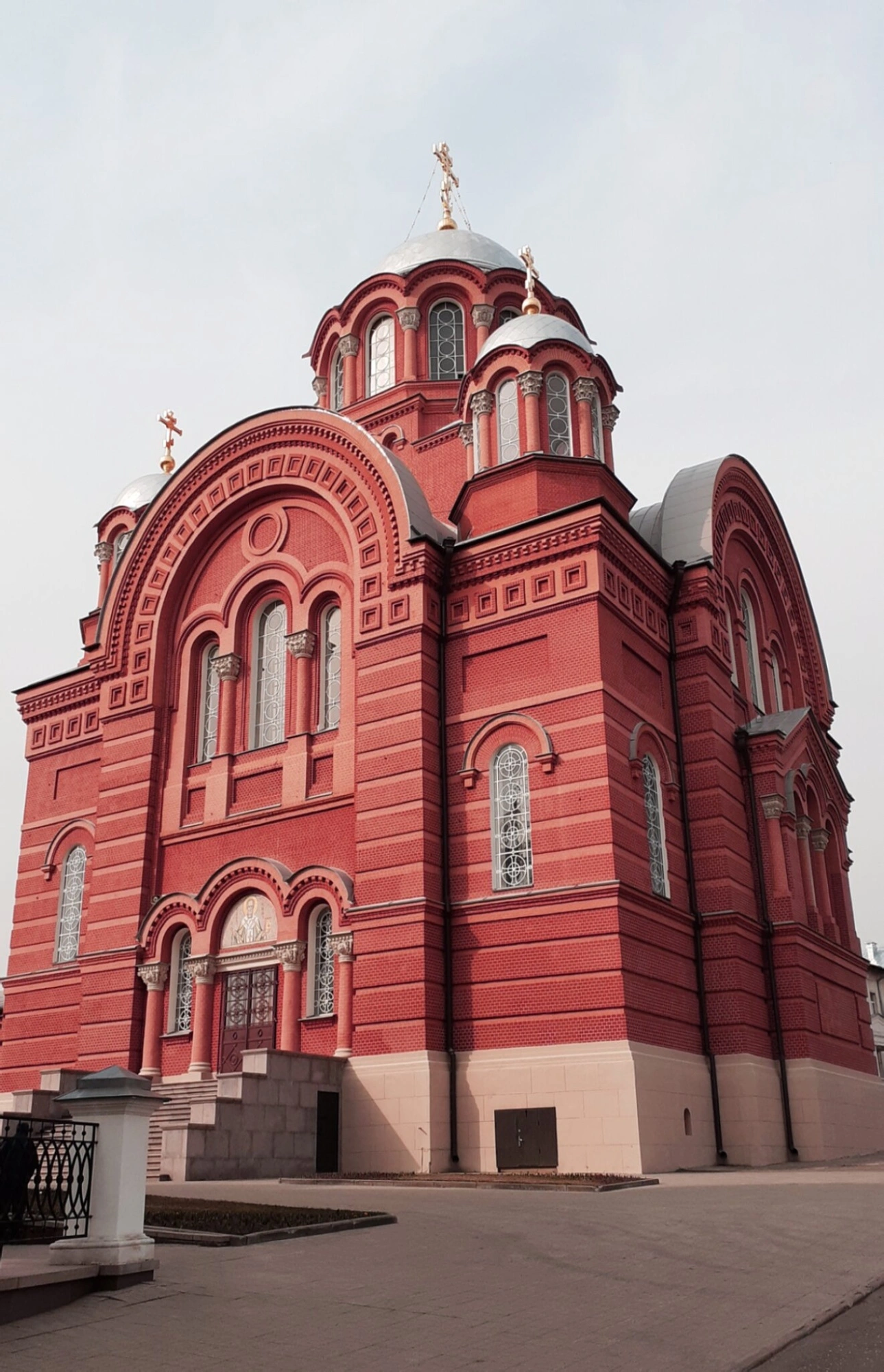 На представленной фотографии запечатлён храм во имя святителя Николая Чудотворца, расположенный на территории Покровского Хотькова ставропигиального женского монастыря в городе Хотьково Московской области. Этот пятиглавый собор, возведённый из красного кирпича в русском эклектичном стиле, является одним из ключевых архитектурных ансамблей обители.