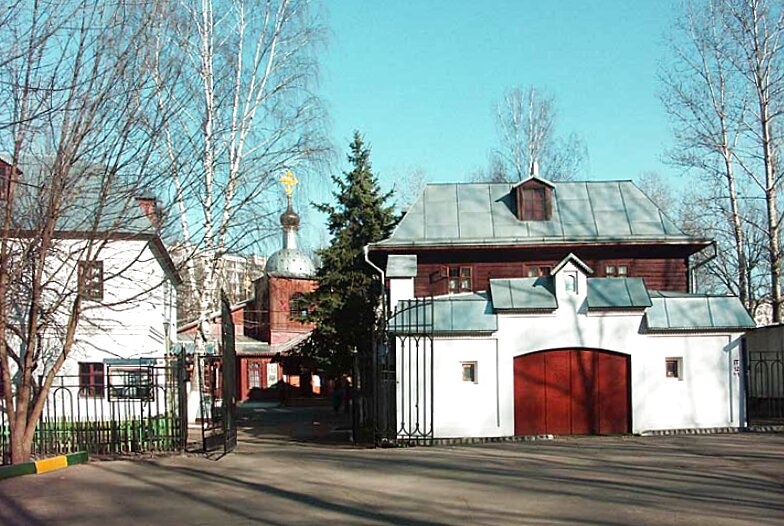 На представленной фотографии запечатлён вход на территорию храмового комплекса Церкви Николая Чудотворца, расположенной в районе Бирюлёво Восточное города Москвы. Снимок позволяет увидеть святые врата, ведущие в обитель, а также часть деревянного храма с возвышающимся над ним куполом, увенчанным православным крестом.