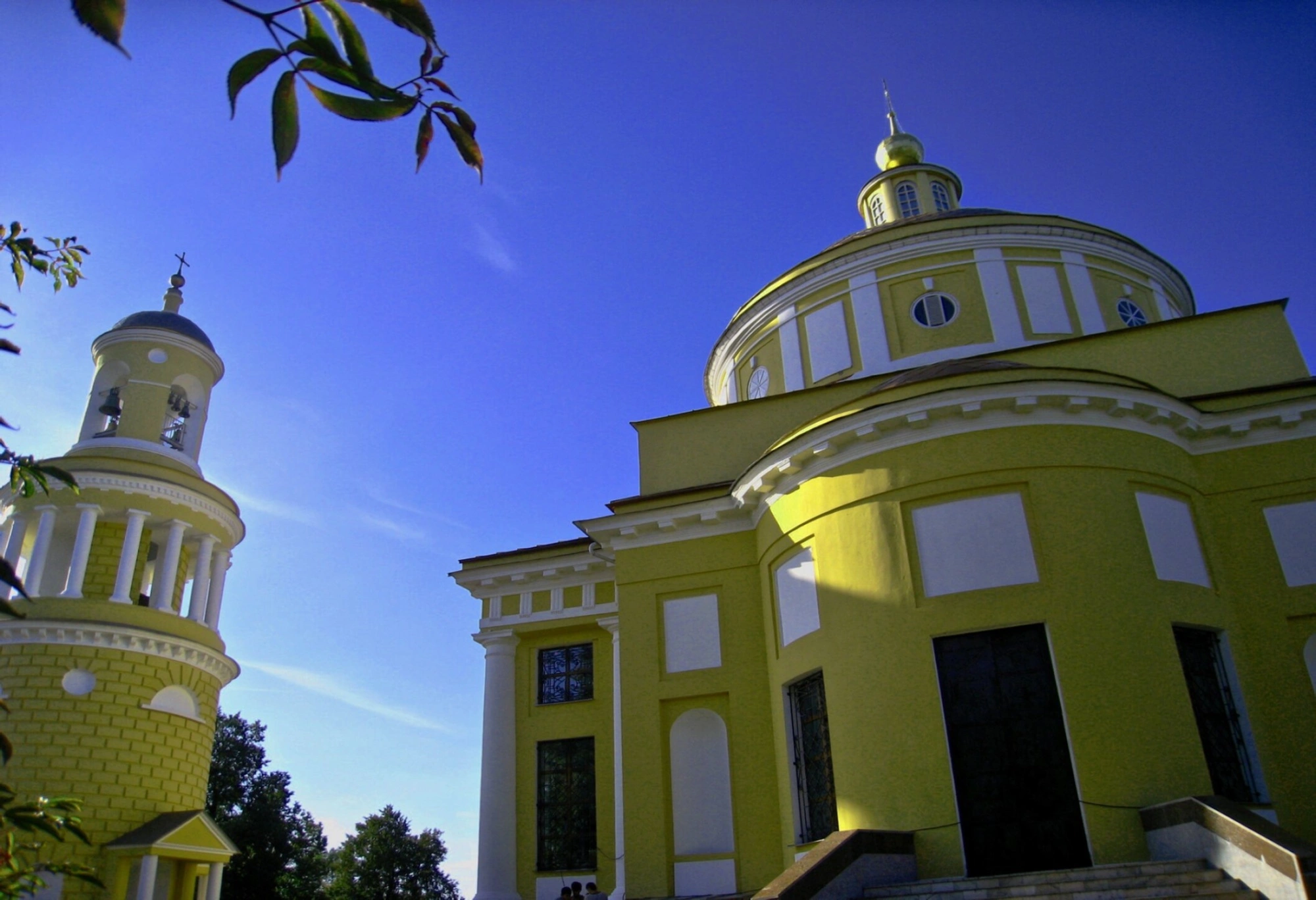 На переднем плане фотографии видны ветви деревьев, что создаёт эффект естественного обрамления и подчёркивает гармоничное единство творения рук человеческих и природы. Храм был возведён в 1793 году на средства князя Ивана Сергеевича Гагарина, представителя знатного рода, и является образцом стиля зрелого классицизма. В советское время церковь, как и многие другие святыни, была закрыта и подверглась разорению, но в настоящее время возвращена верующим и является действующей, в ней регулярно совершаются богослужения.