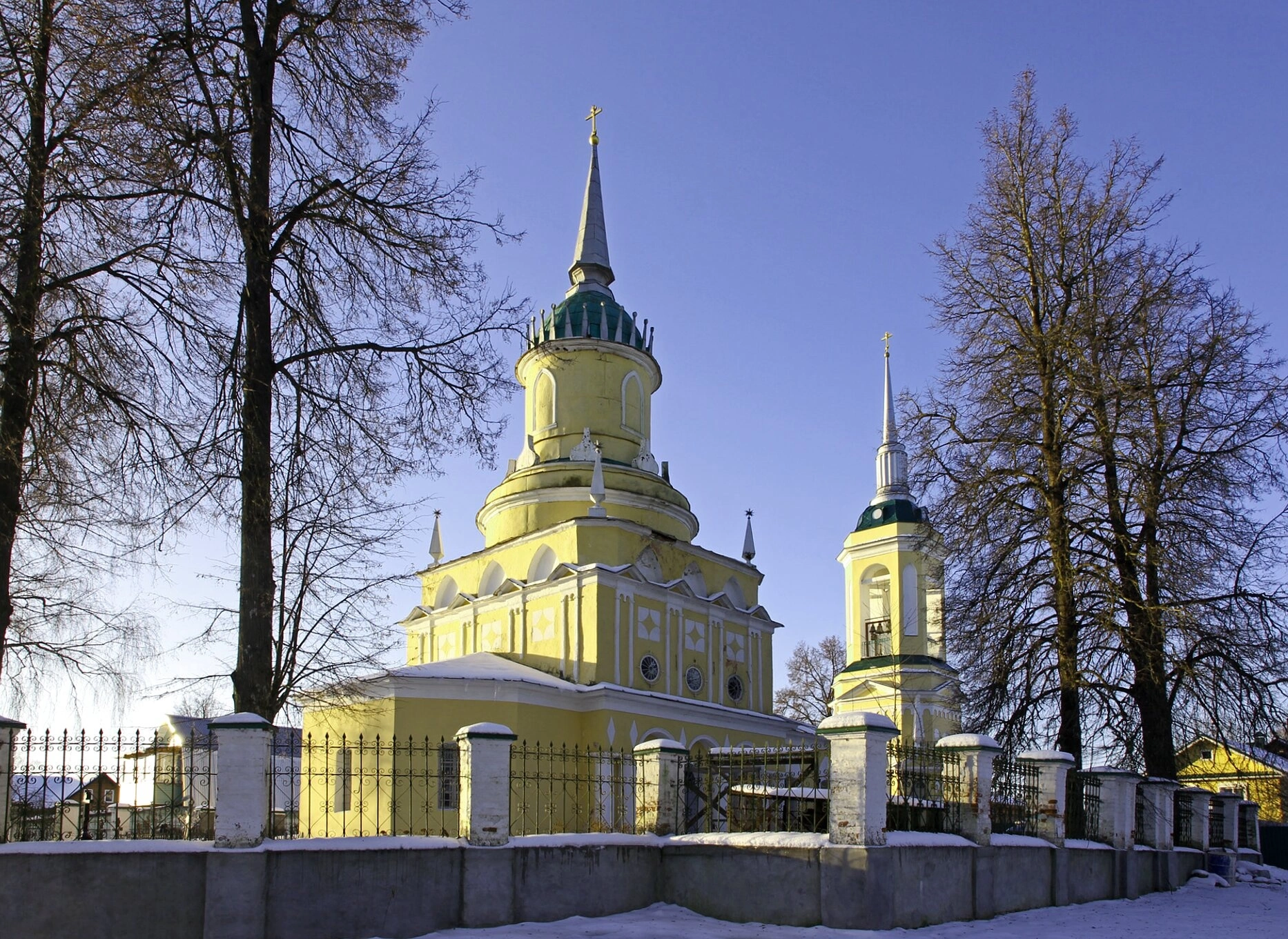 Снимок сделан в зимний период, о чём свидетельствует снежный покров, укутавший землю, и деревья без листвы на фоне чистого голубого неба. Чёткие тени указывают на ясную погоду и дневное освещение. Территория вокруг храма благоустроена: видна ограда с каменными столбами и коваными металлическими решётками, подчёркивающая значимость священного места.