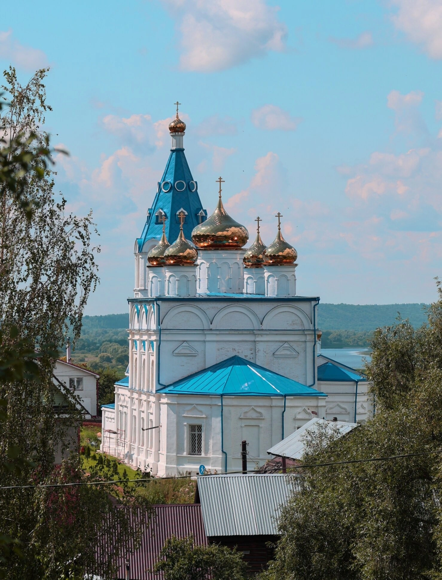 Окружение храма добавляет кадру особой благодатной атмосферы. Святыня гармонично вписана в природный ландшафт: её обрамляет густая зелень деревьев, а на заднем плане угадываются просторы рязанской земли. Место для строительства было выбрано неслучайно — возвышенность не только делает церковь видимой издалека, но и напоминает о стремлении человеческой души к горнему миру.