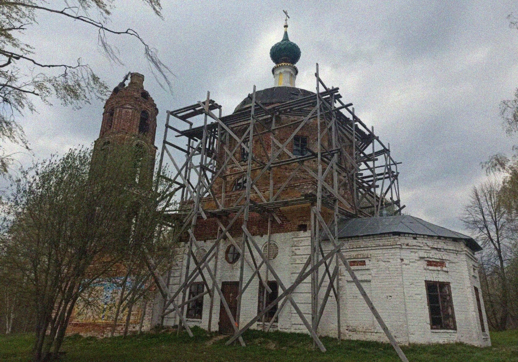 На представленной фотографии запечатлён храм во имя Святителя Николая Чудотворца, расположенный в старинном селе Кузьмино Ивановской области. Святыня, пережившая годы забвения и разрухи, ныне пребывает в состоянии благодатной реставрации, что символизируют окружающие её строительные леса.