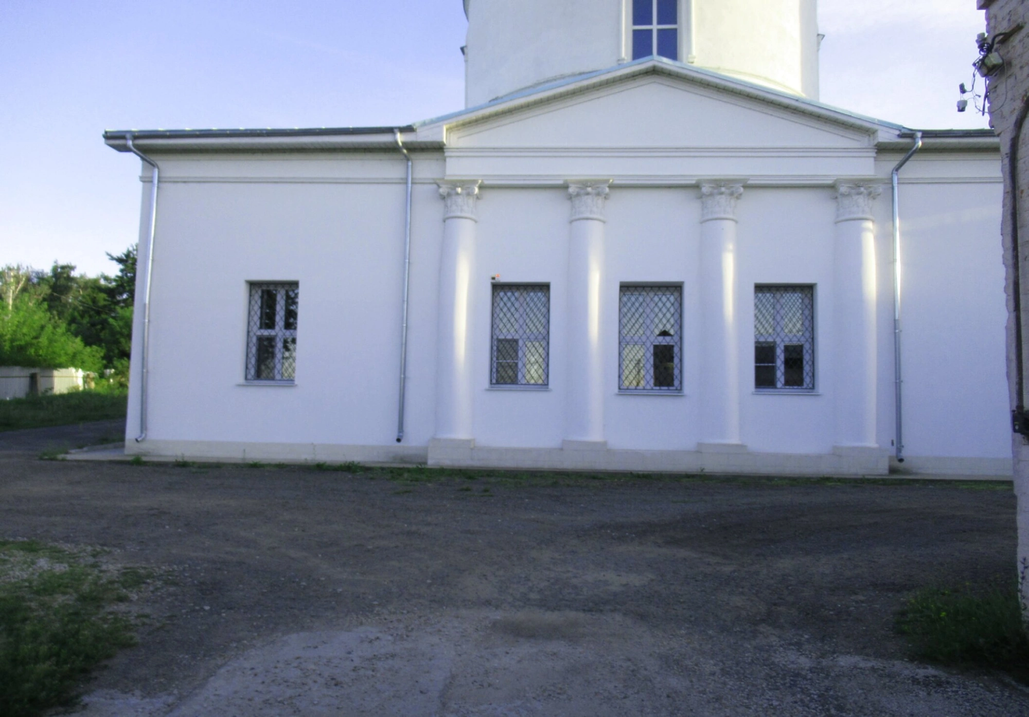Архитектурный облик храма отличается строгой благодатью и гармонией пропорций. Центральный объём венчает световой барабан с луковичным куполом, увенчанным крестом во славу Господню. Главный фасад украшает монументальный портик с шестью колоннами дорического ордера, несущими массивный треугольный фронтон, что придаёт зданию особую торжественность и величие. Прямоугольные оконные проёмы, обрамлённые лаконичными наличниками, наполняют внутреннее пространство обильным естественным светом.