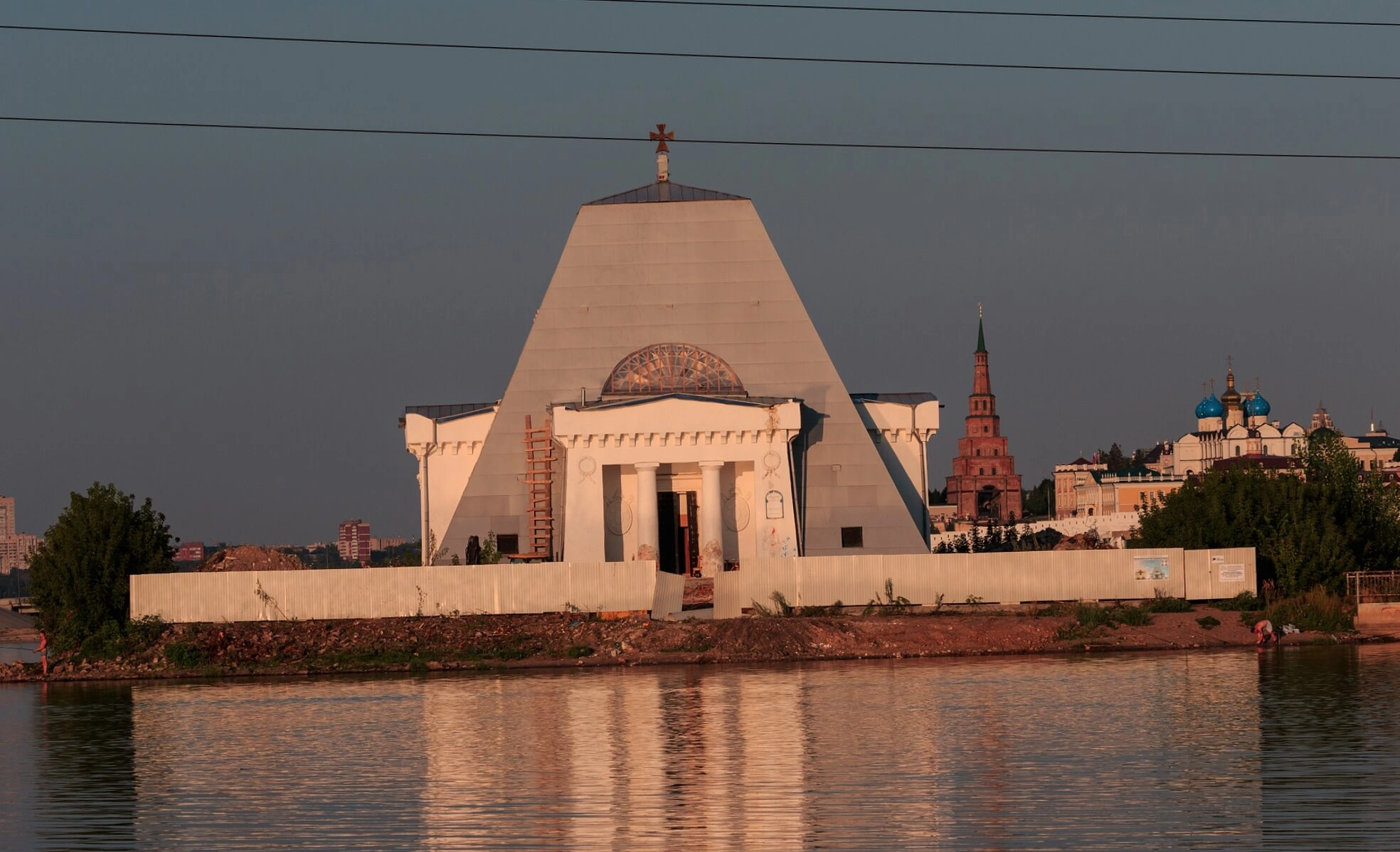 На фотографии запечатлён храм-памятник в честь Нерукотворного Образа Спасителя, возведённый на берегу реки Казанки в память о воинах, погибших при взятии Казани в 1552 году. Снимок сделан в ясный день; золотистый солнечный свет мягко ложится на белокаменные стены, а спокойная водная гладь отражает величественный силуэт памятника. На переднем плане видна водная поверхность, вдоль берега тянется невысокая ограда. Центральный объём храма выполнен в форме усечённой пирамиды, увенчанной крестом, — такой архитектурный образ был избран архитектором Николаем Алфёровым под влиянием древнеегипетских и древнегреческих традиций. Над главным входом размещён полукруглый мозаичный образ, а фасад украшают греческие портики с дорическими колоннами. Слева и справа от памятника видны зелёные деревья и кустарники, а на заднем плане, справа от храма, возвышаются исторические сооружения Казанского Кремля, включая башню Сююмбике и здания с голубыми куполами.