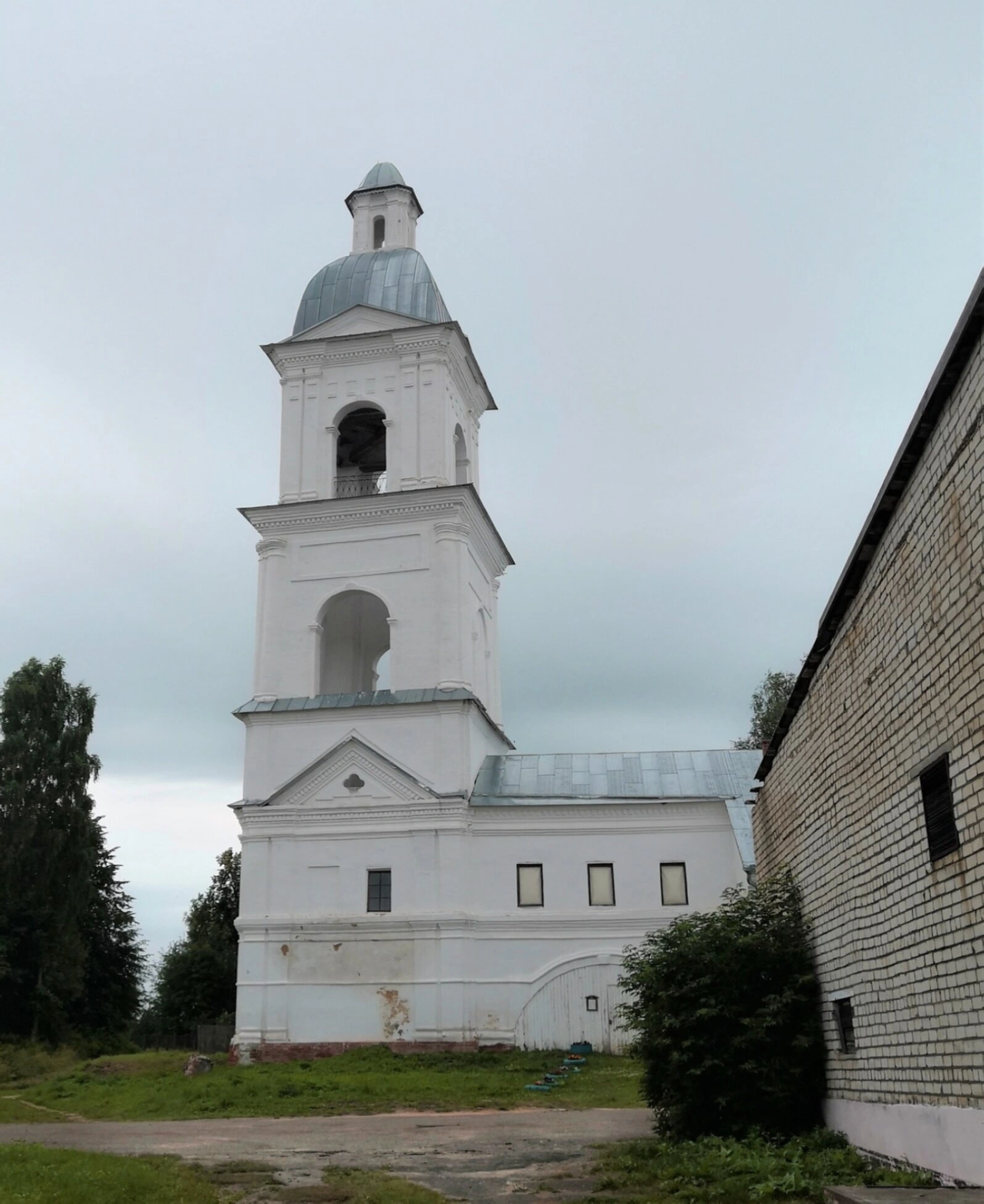 На представленной фотографии запечатлена колокольня старинного православного храма, расположенного в селе Большое Село Ярославской области. Это сооружение является частью архитектурного ансамбля церкви в честь святой великомученицы Параскевы Пятницы, почитаемой на Руси покровительницы семьи и домашнего очага. При храме также имеется придел, освящённый во имя святителя Николая Чудотворца, одного из самых почитаемых христианских святых.