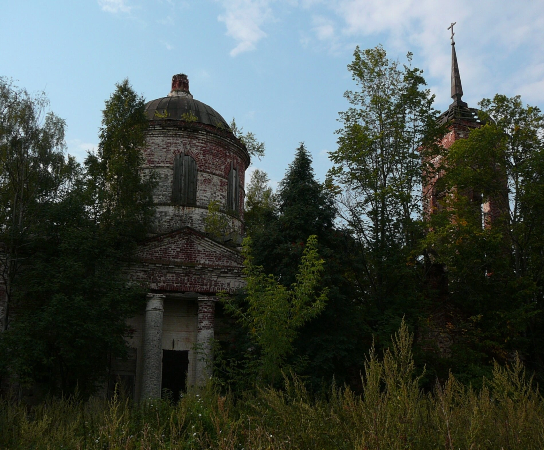 Кирпичный храм с колокольней был возведён в XIX веке на средства прихожан. Архитектура здания характерна для позднего классицизма, распространённого в провинциальном церковном зодчестве того периода. Основной объём храма венчался куполом на световом барабане, который ныне частично обрушен. С западной стороны к церкви примыкает трёхъярусная колокольня, завершавшаяся шпилем с крестом, ныне также сильно пострадавшая от времени и neglect.
