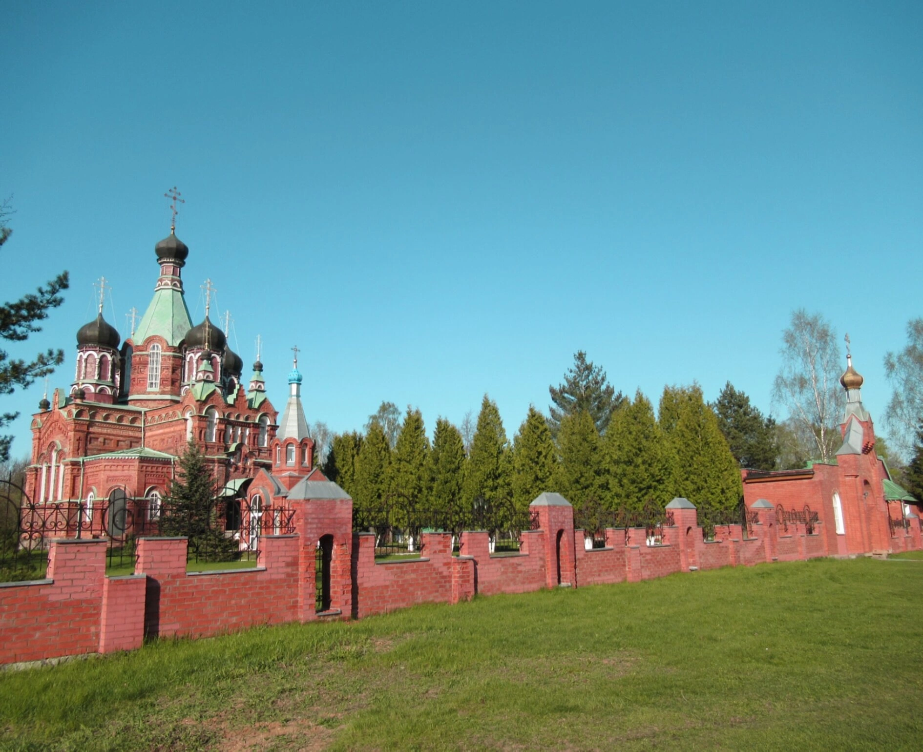На представленной фотографии запечатлён православный храм в честь святых первоверховных апостолов Петра и Павла, расположенный в городе Ярцево Смоленской области. Здание, выстроенное из красного кирпича, увенчано зелёными куполами с сияющими позолоченными крестами, а его монументальный облик отражает традиции церковного зодчества. Территория храма обнесена кирпичной оградой и благоустроена.