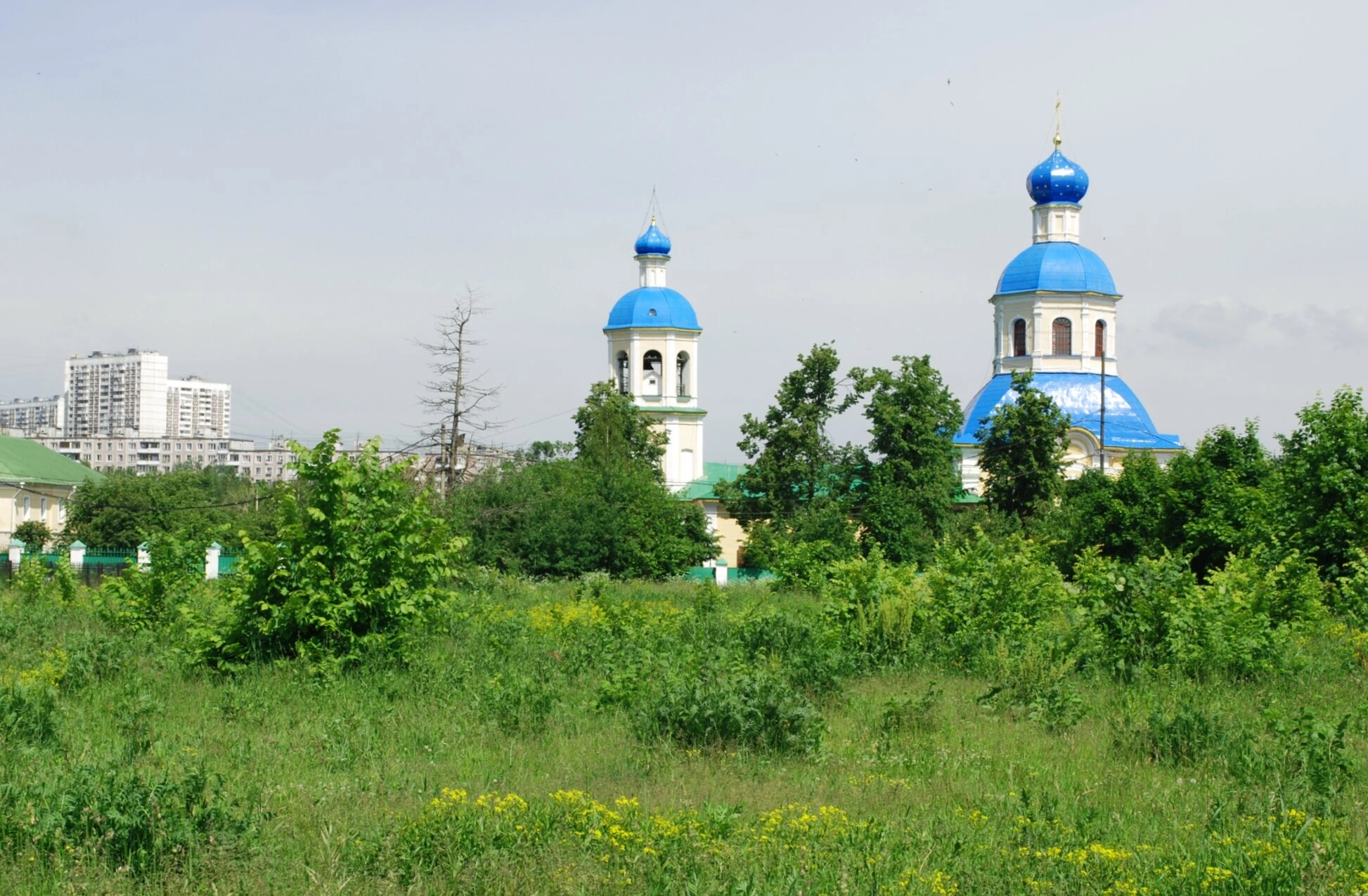 Храм окружает обильная растительность - густые деревья и кустарники создают естественное обрамление святыни. На переднем плане видны луговые травы и полевые цветы, подчеркивающие единство творения Божия. На заднем плане просматриваются современные жилые здания, что свидетельствует о нахождении храма в городской черте и его духовном служении в условиях мегаполиса.
