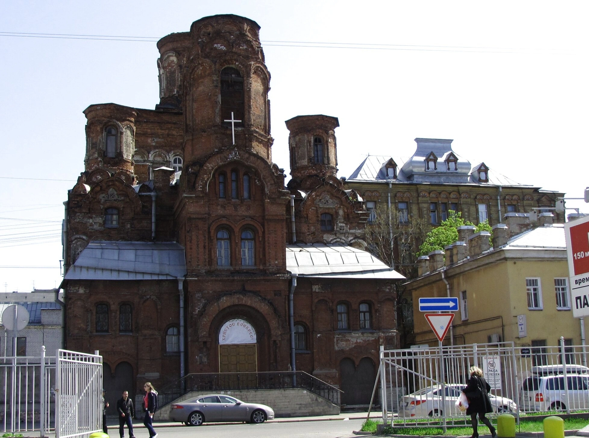 На снимке хорошо просматривается монументальный объём здания, выполненный в русско-византийском стиле, который был характерен для храмового зодчества периода правления Александра III. Фасад украшают арочные оконные проёмы, килевидные кокошники и декоративные пояса из фигурного кирпича. Фотография позволяет рассмотреть центральный барабан, увенчанный шлемовидным куполом и православным крестом, возносящимся в небо.