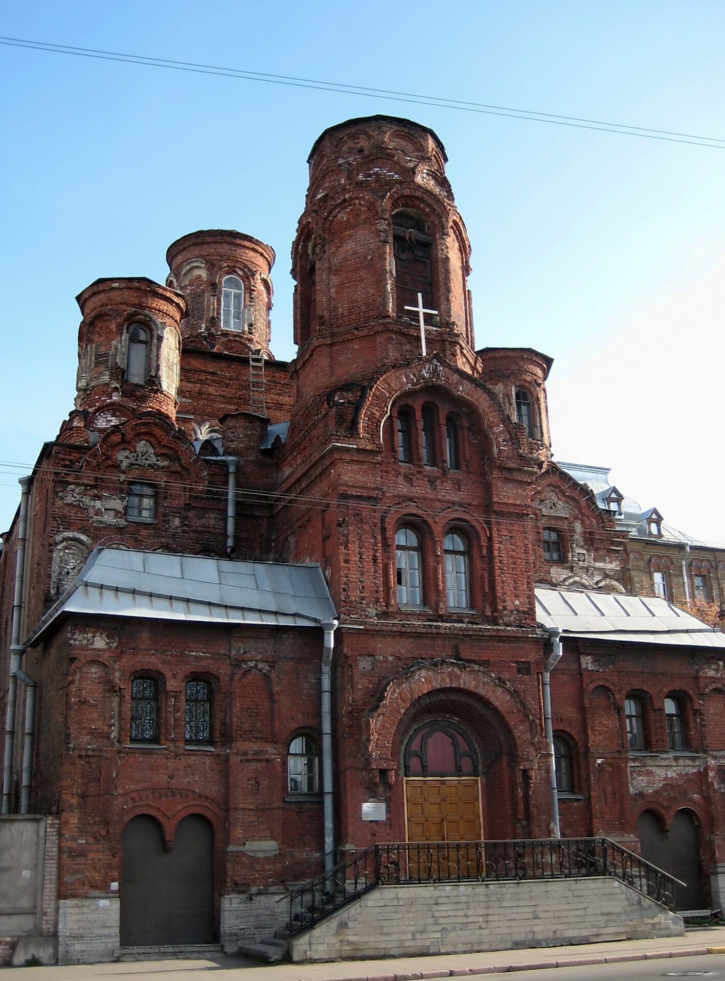 На представленной фотографии запечатлён величественный облик Храма в честь Покрова Пресвятой Богородицы, что располагается на Боровой улице в Санкт-Петербурге. Святыня, возведённая из красного кирпича, является выдающимся памятником церковной архитектуры конца XIX века и важным духовным центром города.