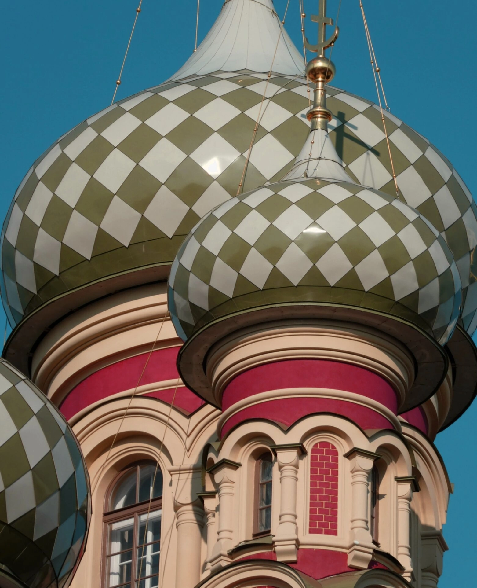 На представленной фотографии запечатлены величественные купола и уникальные архитектурные элементы храма Покрова Пресвятой Богородицы, что располагается на Боровой улице в Санкт-Петербурге. Данный православный храм, освящённый в честь Покрова Божией Матери, является выдающимся памятником церковной архитектуры конца XIX века.