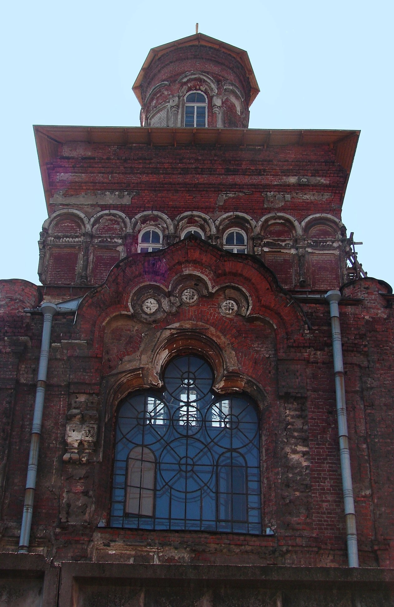 Здание храма, освящённое в честь Покрова Божией Матери, представляет собой образец церковной архитектуры начала XX века. На фотографии можно видеть характерные элементы православного зодчества: луковичные главки, увенчанные золочёными крестами, и килевидные закомары, украшающие фасад. Стены из красного кирча с декоративными деталями из светлого камня создают торжественный и нарядный облик.