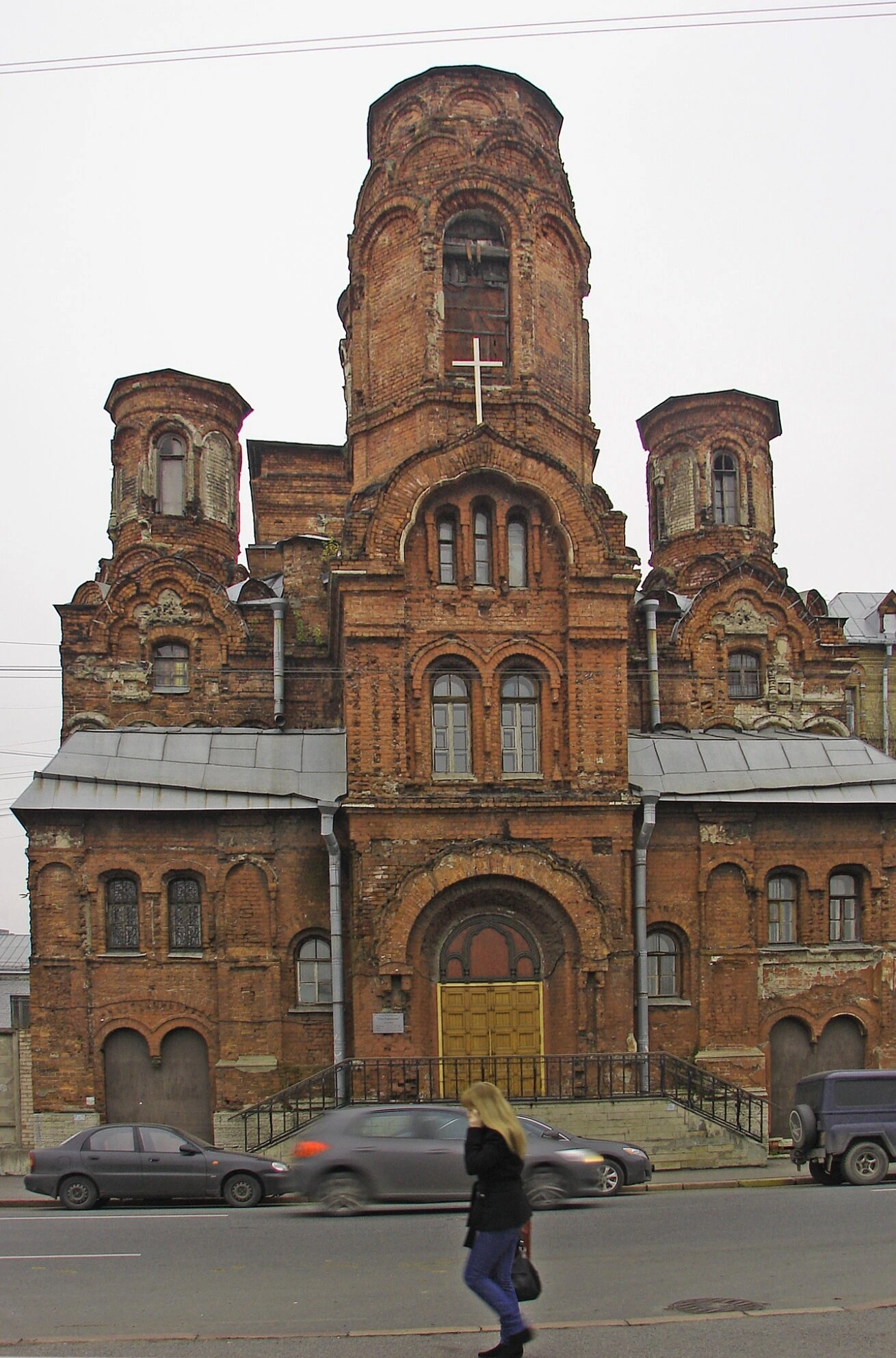 На представленной фотографии запечатлён фрагмент фасада Храма Покрова Пресвятой Богородицы, являвшегося подворьем Свято-Антониево-Дымского мужского монастыря. Здание расположено в Санкт-Петербурге по адресу Боровая улица, 52. Снимок демонстрирует характерную для русского церковного зодчества конца XIX века кирпичную кладку и уцелевшие архитектурные элементы, свидетельствующие о былом благолепии святыни.