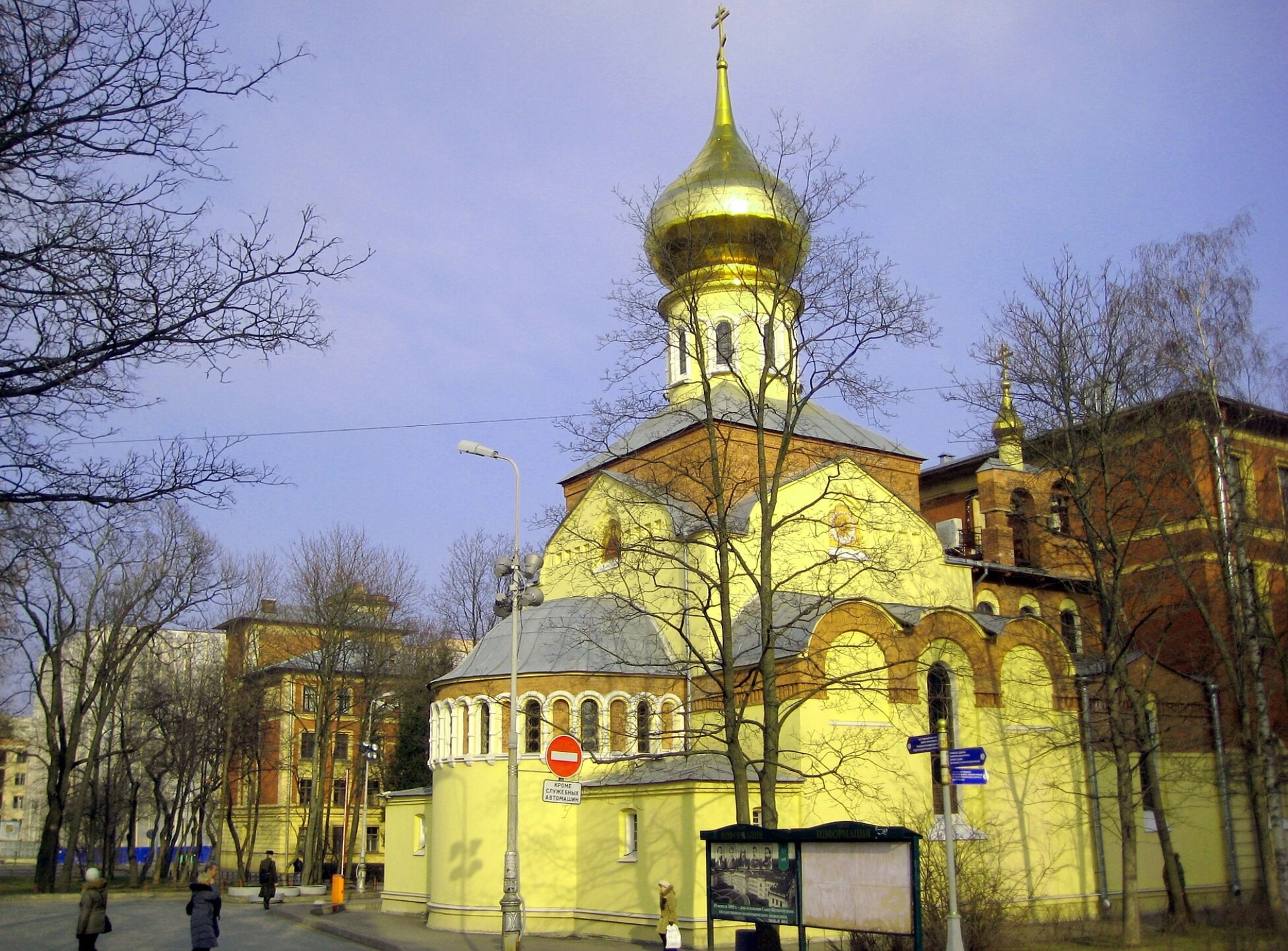 На снимке видно, что храм окружен деревьями, которые в момент съемки находятся в зимнем состоянии без листвы. Рядом расположены университетские постройки, что подчеркивает интеграцию духовного образования с научным. Прихрамовая территория благоустроена, имеется пешеходная зона с дорожной разметкой.