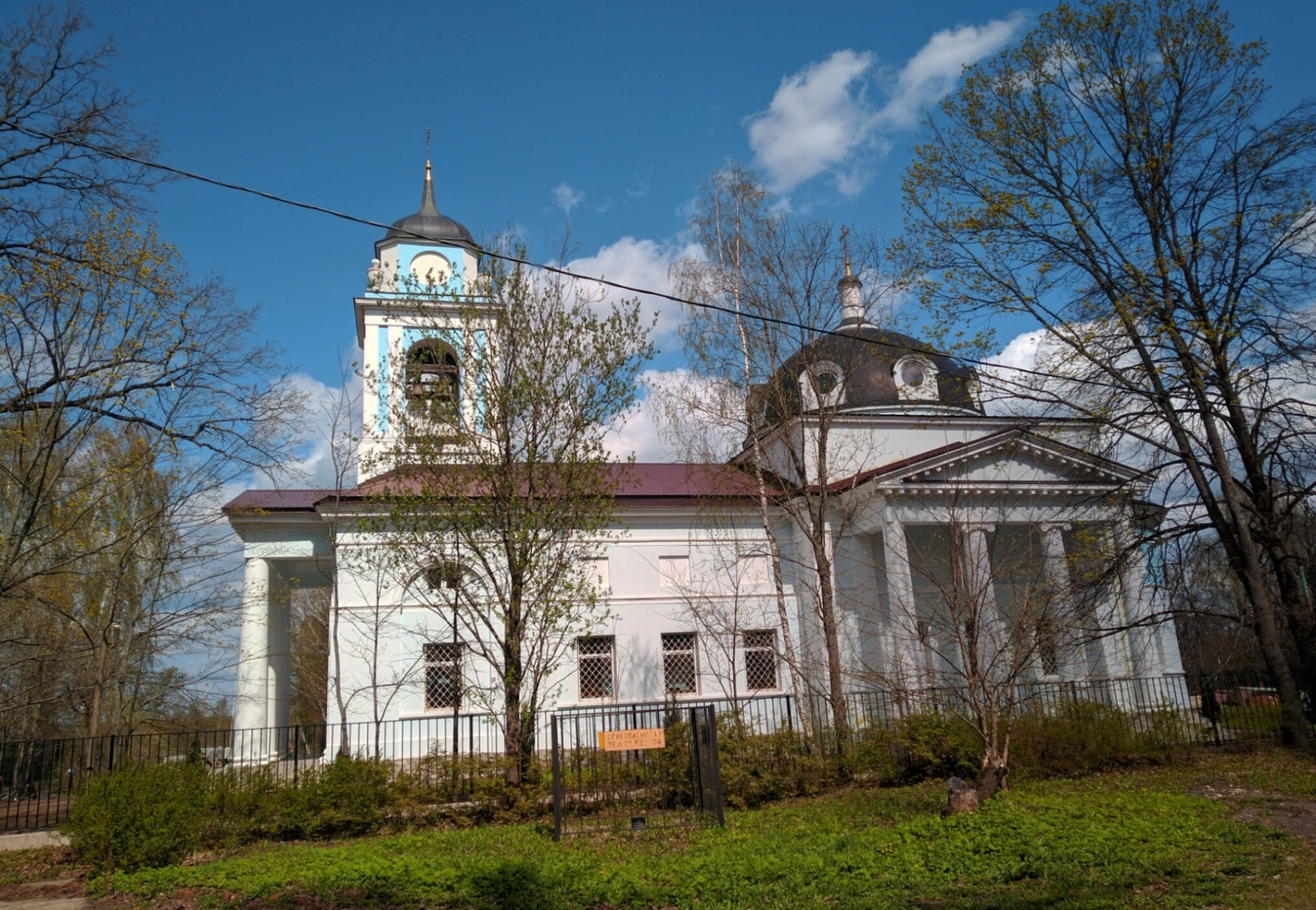 Здание церкви представляет собой каменный однокупольный храм в стиле классицизма, характерном для церковного зодчества конца XVIII — начала XIX веков. Чёткие пропорции и строгие линии фасада гармонично сочетаются с изящной колокольней, увенчанной шпилем. Голубые небеса с легкими облаками и молодая зелёная листва окружающих деревьев подчёркивают величие и духовную чистоту этого святого места.