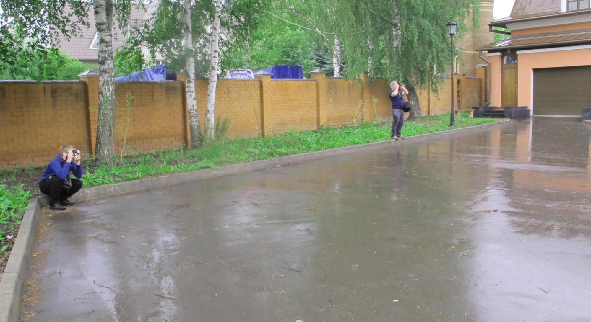На переднем плане изображены фотографы, застигнутые в процессе работы, что подчёркивает необычайную красоту и художественную ценность открывающегося вида. За низким кирпичным ограждением возвышаются белоствольные берёзы, зелёные насаждения которых оттеняют монументальность церковного строения.