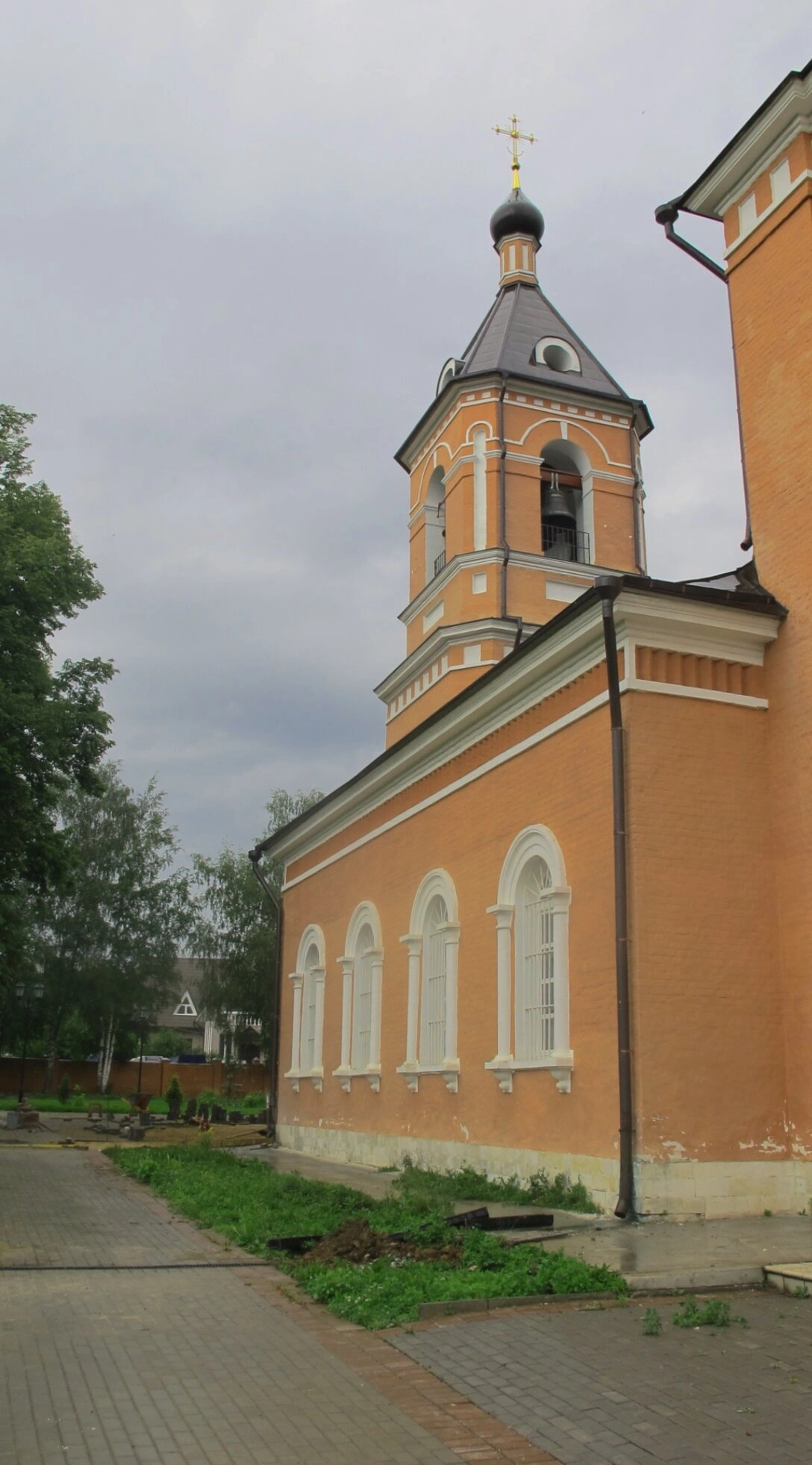 Перед святым входом в храм видна мощёная дорожка, ведущая к вратам обители. Небольшой участок земли с зелёной растительностью обрамляет церковь, а на заднем плане фотографии виднеются тенистые деревья и часть других строений, что создаёт ощущение умиротворённости и покоя, свойственного этому священному месту. Небесный свод в момент съёмки был затянут облаками, что придаёт кадру особое, созерцательное настроение.