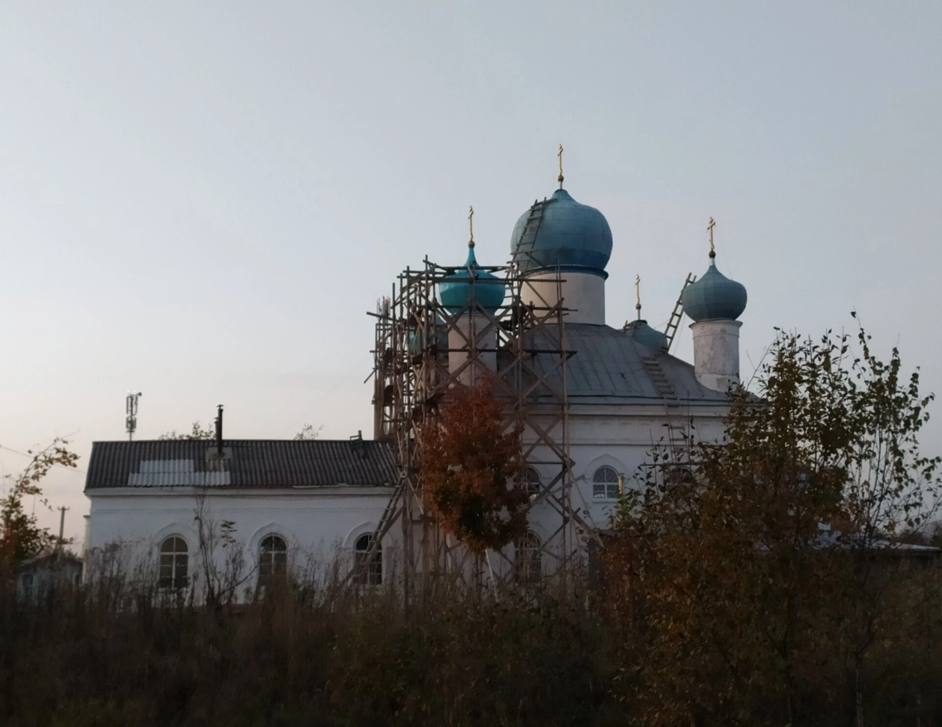 Белоснажные стены храма символизируют духовную чистоту и благодать, а лазурные купола, увенчанные золочёными крестами, устремляются к небесам, олицетворяя молитвенное горение. Один из куполов окружён строительными лесами, что свидетельствует о проведении благочестивых трудов по восстановлению и сохранению этой святыни для будущих поколений.