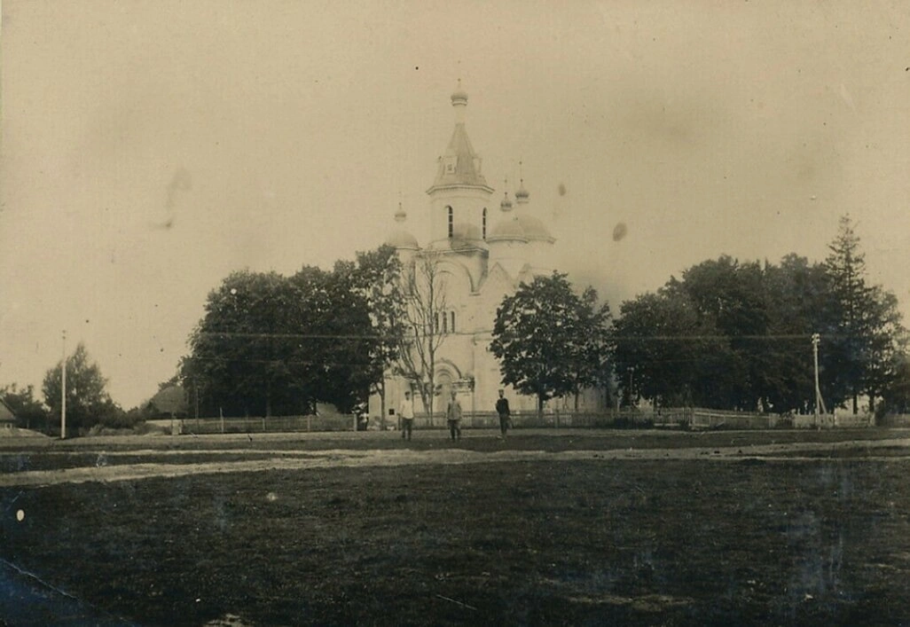 Храм располагается в живописной сельской местности, что подчёркивает его неразрывную связь с окружающим природным ландшафтом и местной общиной. На переднем плане фотографии видны фигуры прихожан, что свидетельствует о том, что храм был и остаётся духовным центром для верующих.