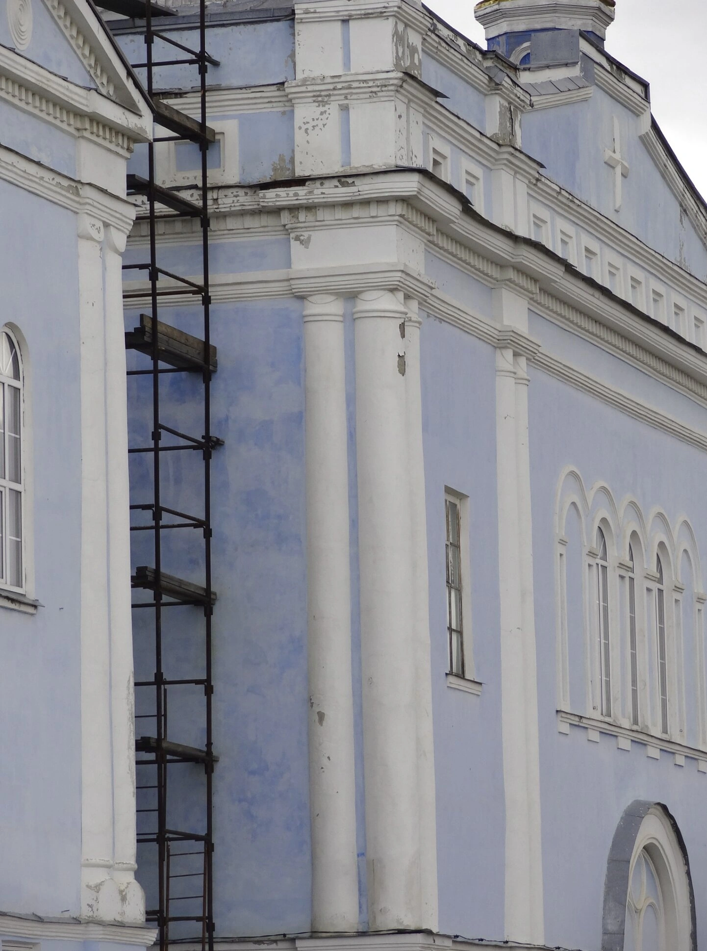 На изображении заметны арочные окна с белыми наличниками, характерные для традиционного русского церковного зодчества, а также колонны, придающие фасаду торжественность и величие. С левой стороны к стене здания приставлены строительные леса, свидетельствующие о проведении реставрационных работ по сохранению архитектурного наследия.