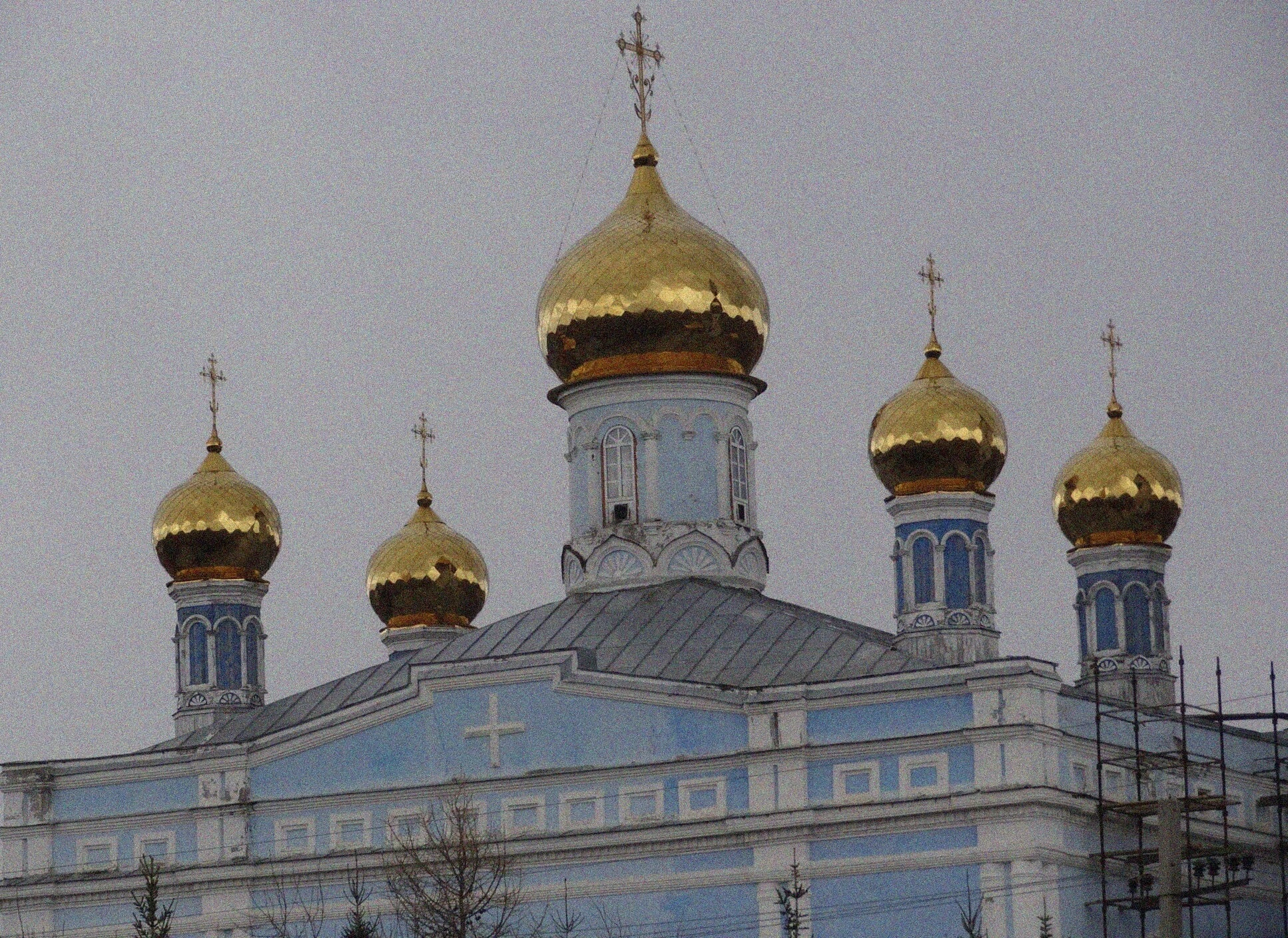 На снимке видно, что в момент фотографирования на храме проводились ремонтно-реставрационные работы, о чём свидетельствуют строительные леса с правой стороны здания. Это говорит о непрестанной заботе прихожан и благотворителей о сохранении святыни для будущих поколений. Деревья на переднем плане, лишённые листвы, и пасмурное небо создают атмосферу тихого умиротворения, свойственную поздней осени или ранней весне в уральском крае.