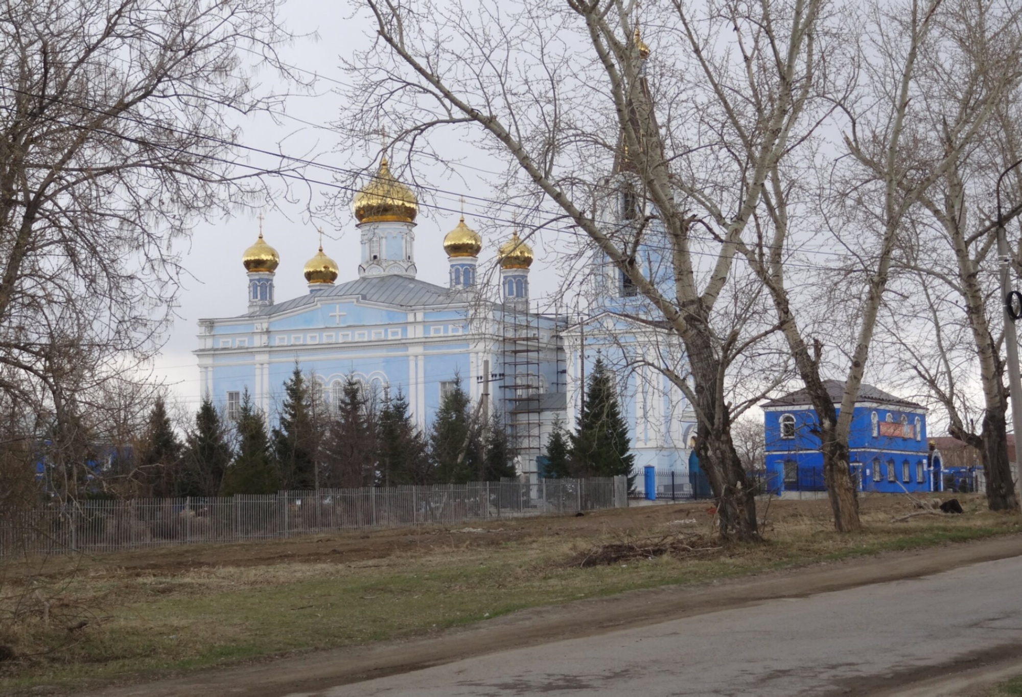 На снимке зафиксирован важный этап в жизни святыни — проведение реставрационных работ, о чём свидетельствуют установленные строительные леса. Это подчёркивает непрекращающуюся заботу верующих о сохранении домов Божиих. Храм окружён оголёнными деревьями, что указывает на межсезонье — позднюю осень или раннюю весну, и стоит под пасмурным небом, что придаёт изображению особое, созерцательное настроение.