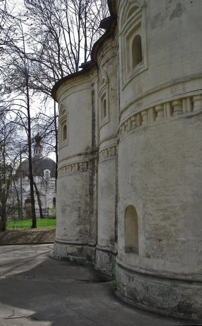 На представленной фотографии запечатлён вид на восточную часть старинного православного храма Покрова Пресвятой Богородицы, что расположен в районе Рубцово в Москве. Снимок позволяет детально рассмотреть алтарные выступы здания — апсиды, характерные для церковной архитектуры. Полукруглые формы апсид, увенчанные скромными главками-луковками, выполнены из светлого камня и богато украшены традиционным для русского зодчества декором: аркатурными поясами, пилястрами и узкими арочными окнами, которые освещают пространство алтаря.