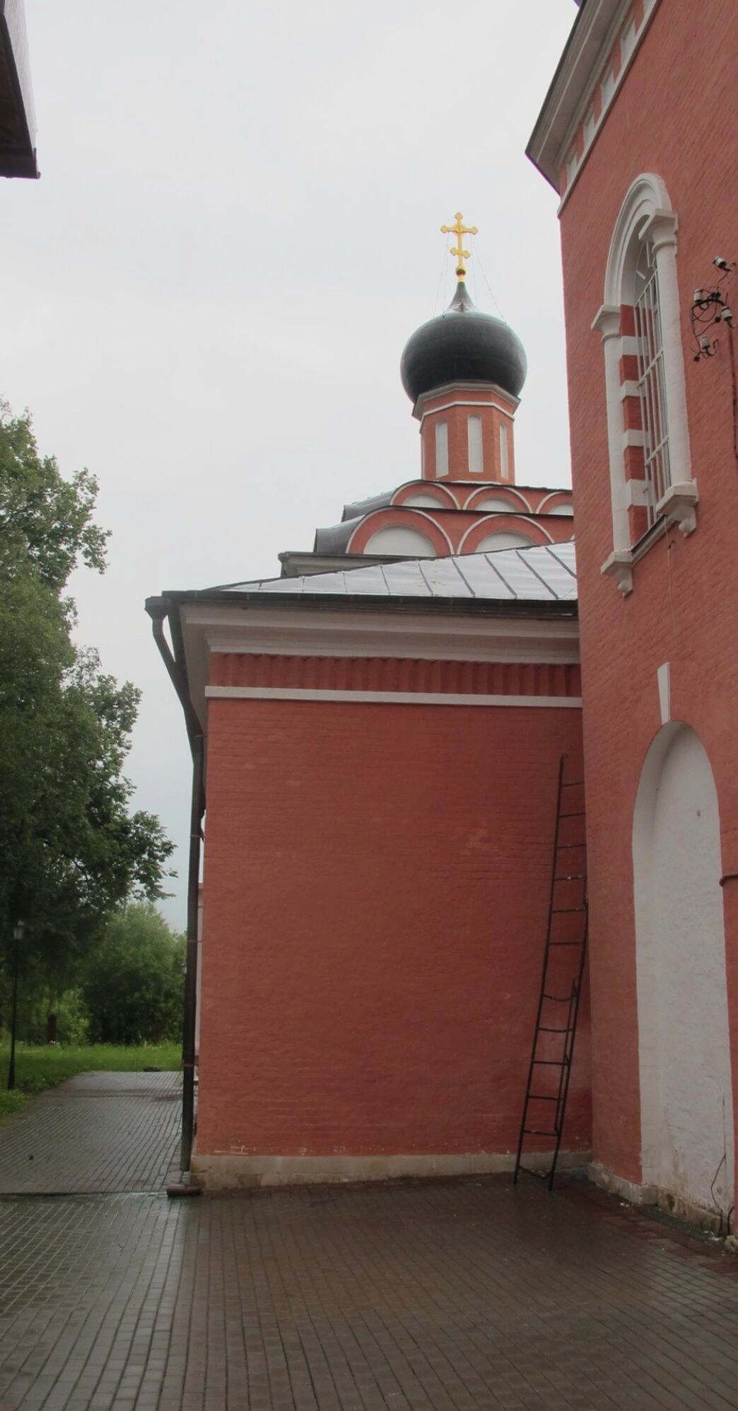 На представленной фотографии запечатлён храм Покрова Пресвятой Богородицы, расположенный в селе Большое Покровское Московской области. Святыня является значимым памятником православной культуры и истории региона. Фотография позволяет детально рассмотреть один из фасадов церковного здания, выполненного из красного кирпича.