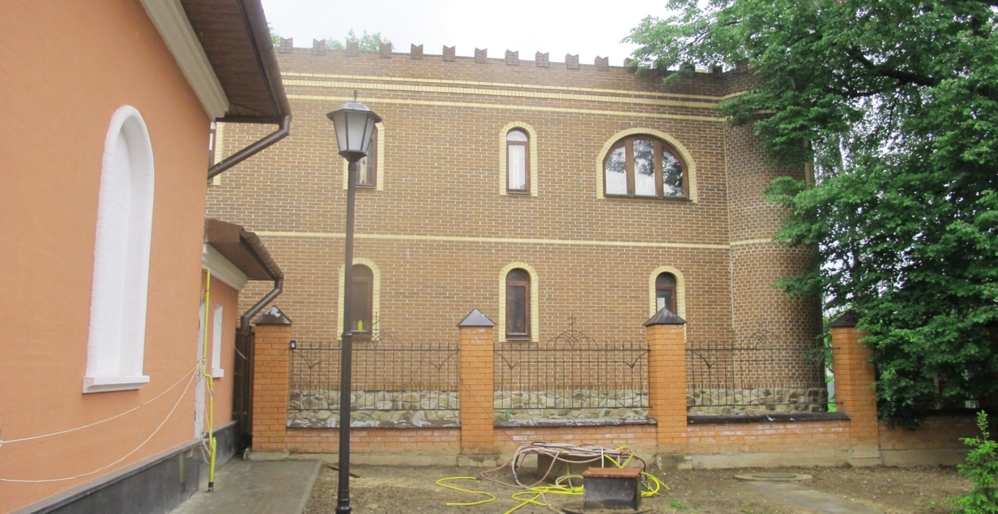 Фасад здания оживляют оконные проемы различной формы, включая арочные и прямоугольные, которые характерны для храмовой архитектуры того периода. Слева от основного здания виден фрагмент ещё одной постройки, выполненной в терракотовом цвете, что suggests о наличии целого храмового комплекса. Территория вокруг церкви благоустроена: перед фасадом установлено невысокое ограждение из кирпичных столбов и кованых металлических решеток, в основании которого присутствует каменная кладка.