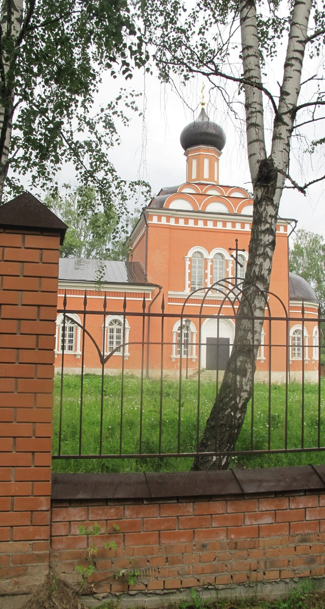 Фасад храма частично скрыт за белоствольными берёзами, чья зелёная листва создаёт естественное обрамление для духовного центра. Эти деревья, являющиеся неотъемлемой частью русского пейзажа, добавляют изображению умиротворённости и природной гармонии. Перед церковью раскинулся ухоженный зелёный газон, обнесённый прочной оградой, сочетающей металлические элементы и кирпичные столбы, что обозначает границу священного пространства.