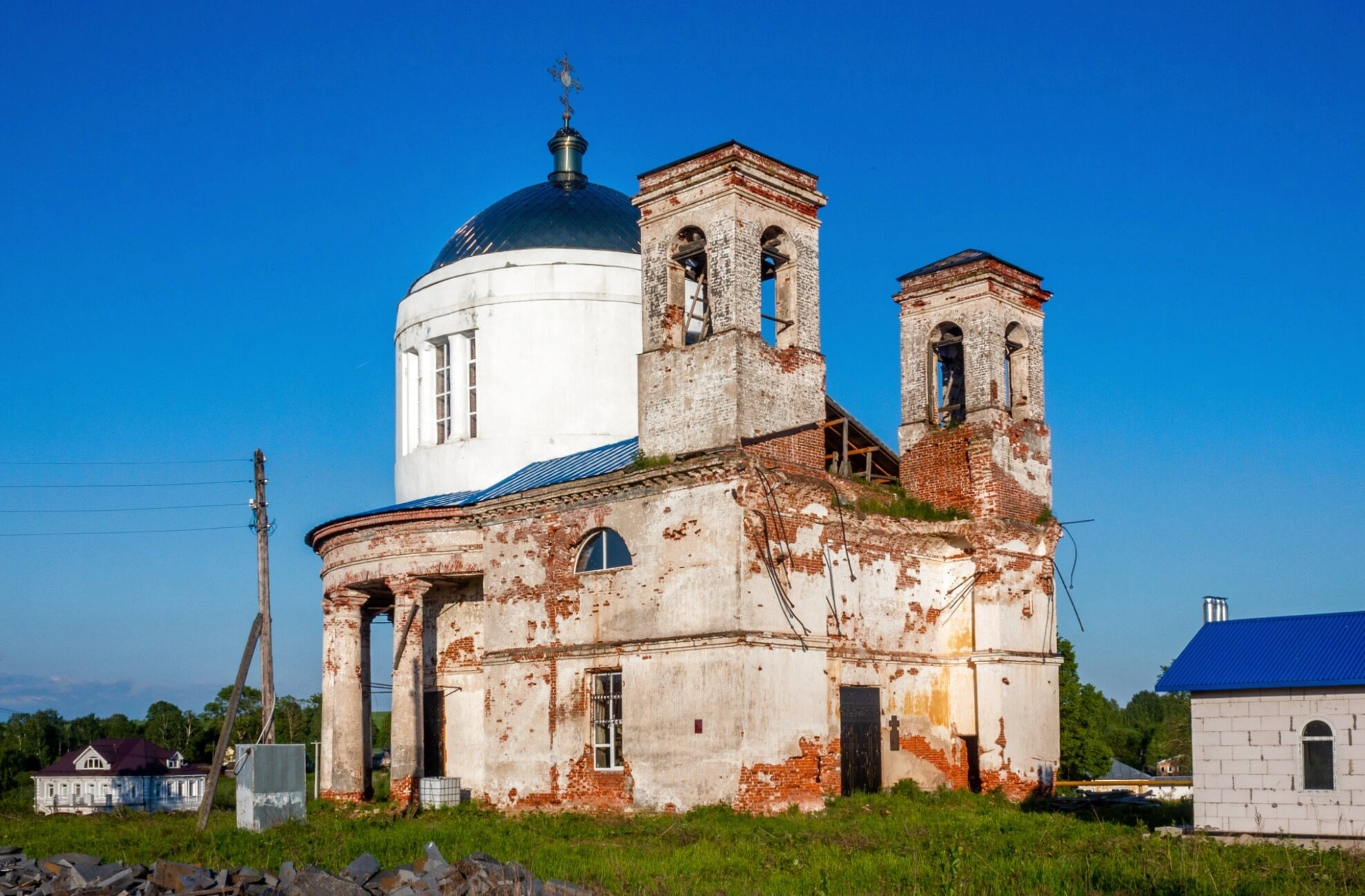 Главный объём храма увенчан массивным световым барабаном, над которым возвышается купол, завершающийся православным крестом, символом искупительной жертвы Христа Спасителя. К основному зданию примыкает многоярусная колокольня, которая, судя по состоянию кладки, требует восстановительных работ. В её верхнем ярусе хорошо видны арочные проёмы, предназначенные для церковных колоколов, призывающих верующих на молитву.