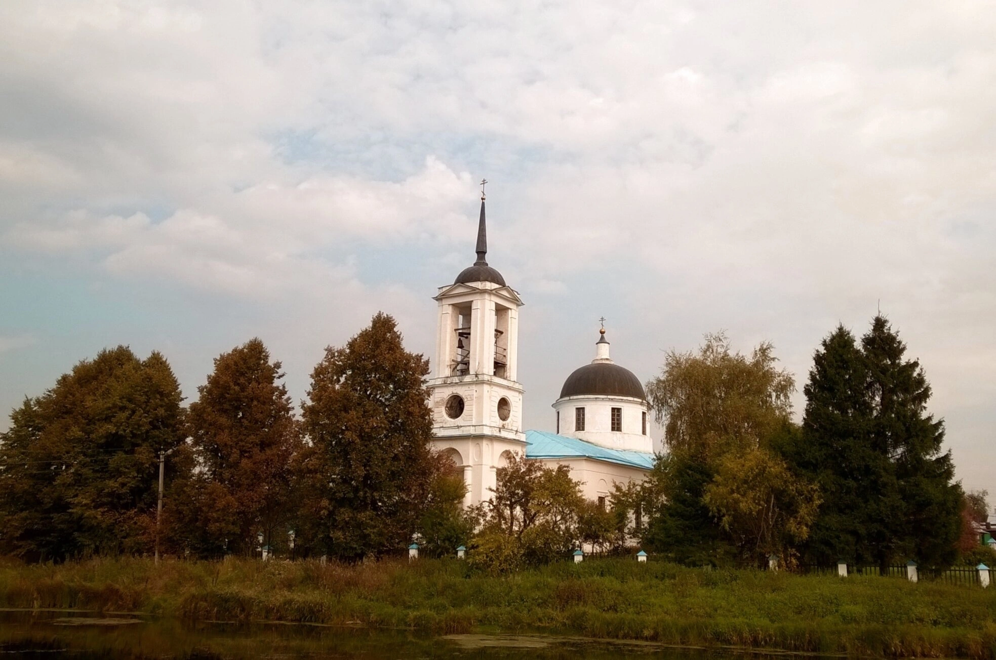На фотографии запечатлён старинный Покровский храм, расположенный в живописной местности подмосковного села Буняково. Белокаменная церковь, освящённая в честь Покрова Пресвятой Богородицы, гармонично вписана в природный ландшафт на берегу речки Малой Северки, также известной как Гнилуша. Её чистейшие белые стены, сложенные из тесаного известняка, и лазурная кровля создают возвышенный и строгий образ, характерный для эпохи русского классицизма.