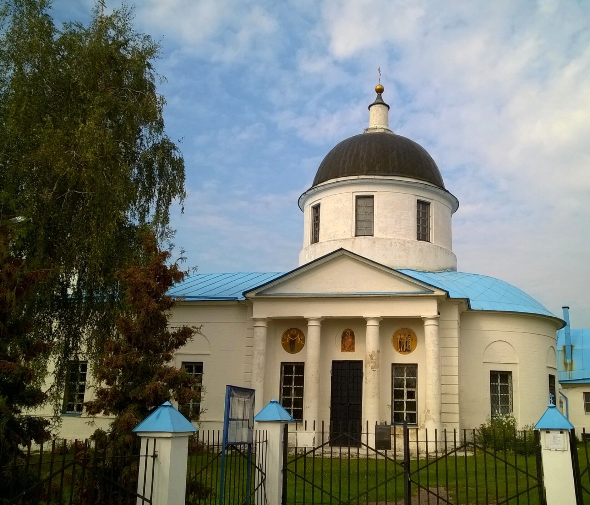 На снимке также видно благоустроенное окружающее пространство. Храм обнесён чёрным металлическим ограждением на белокаменных столбах с синими декоративными завершениями. Слева от здания раскидистое дерево с густой кроной оттеняет белизну стен, а ухоженная зелёная трава подчёркивает атмосферу покоя и чистоты. Фотография передаёт не только архитектурную красоту, но и дух тихого молитвенного места, сохранившего свою святость через века.