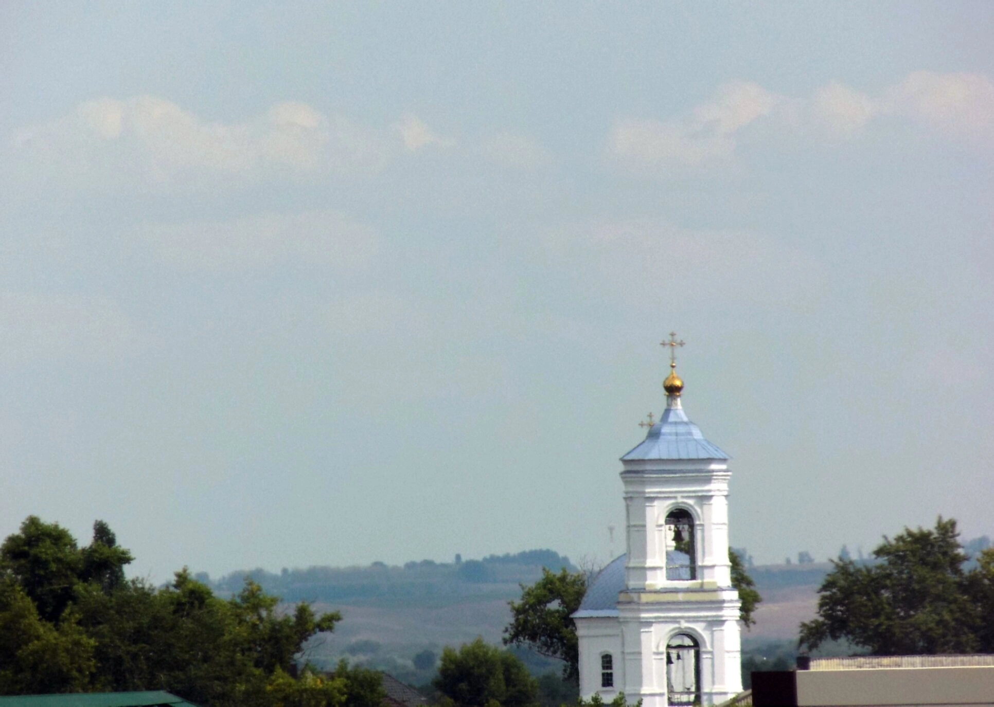 На переднем плане слева видна часть зелёной кровли иного строения, что добавляет композиции глубины и жизненного контекста. На заднем плане простирается холмистая местность Воронежского края под светлым небом с легкими облаками, напоминая о просторах и духовных просторах Святой Руси.