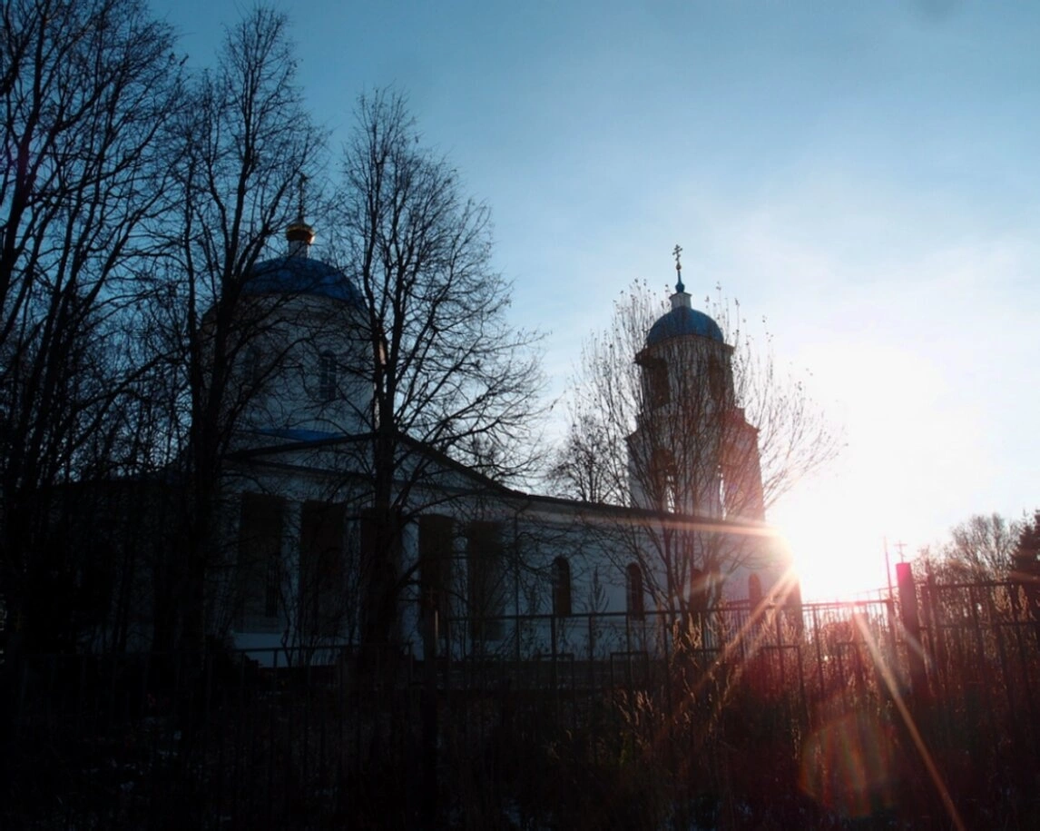 Фотография мастерски передаёт благоговейную атмосферу вечернего времени. Лучи заходящего солнца, пробивающиеся сквозь ветви окружающих храм деревьев, символически озаряют его светом, создавая ощущение божественного присутствия и благодати. Церковь изображена в окружении природы, что подчёркивает её гармоничное единение с русским пейзажем.