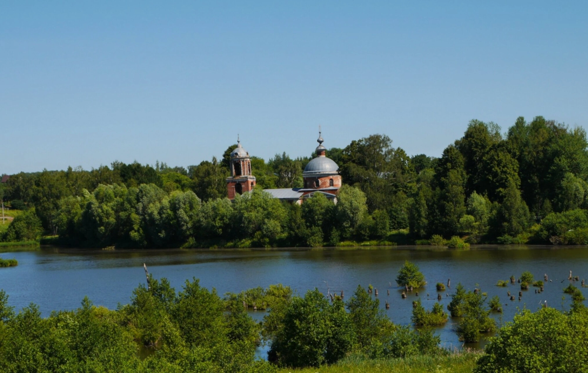 На переднем плане фотографии видны густые заросли прибрежной растительности, обрамляющие водную гладь. Спокойная атмосфера снимка передаёт умиротворение и благодать, свойственные этому святому месту. Церковь Покрова Пресвятой Богородицы в Хонятино является не только памятником архитектуры, но и действующим православным храмом, привлекающим паломников и ценителей русской духовной культуры.