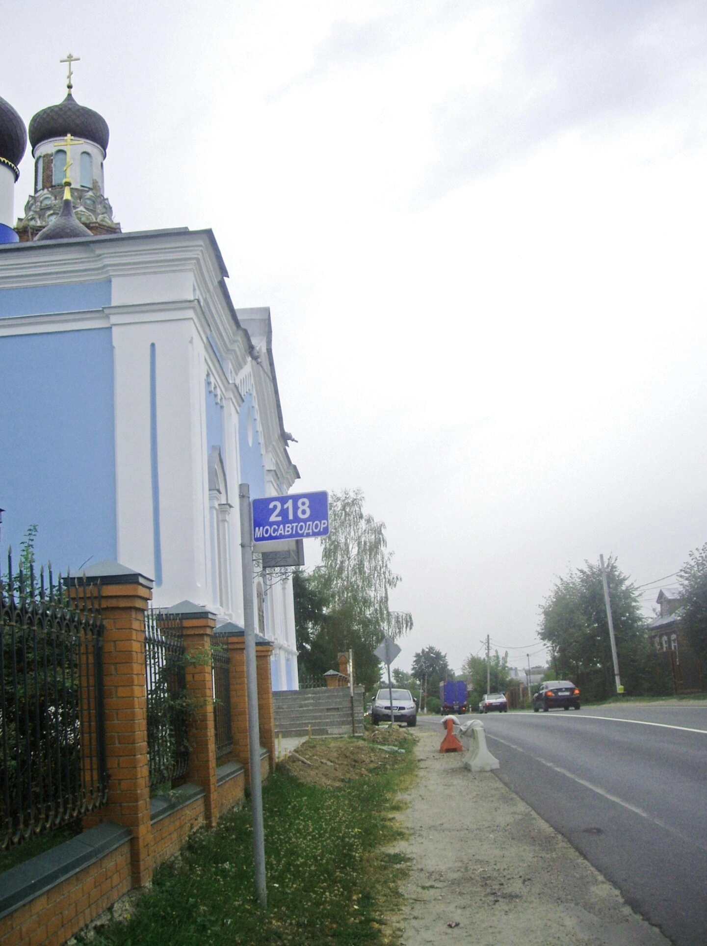 На переднем плане фотографии видна проезжая часть Егорьевского шоссе с движущимся транспортом, что подчёркивает удобное расположение храма для посещения верующими. Прихрамовая территория благоустроена, по левую сторону от дороги виднеются ухоженные деревья и зелёные насаждения, создающие особую атмосферу умиротворения.