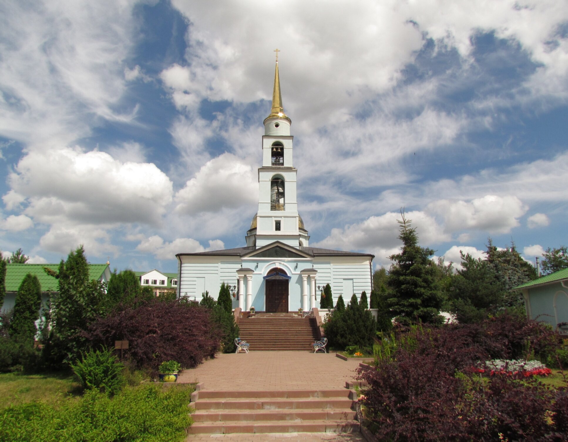 К главному входу в Дом Божий ведёт широкая каменная лестница, символизирующая духовное восхождение верующих к молитве. Храм окружён ухоженной территорией, где произрастают разнообразные хвойные и лиственные насаждения, включая декоративные кустарники, что создаёт атмосферу умиротворения и единения с творением Господним.