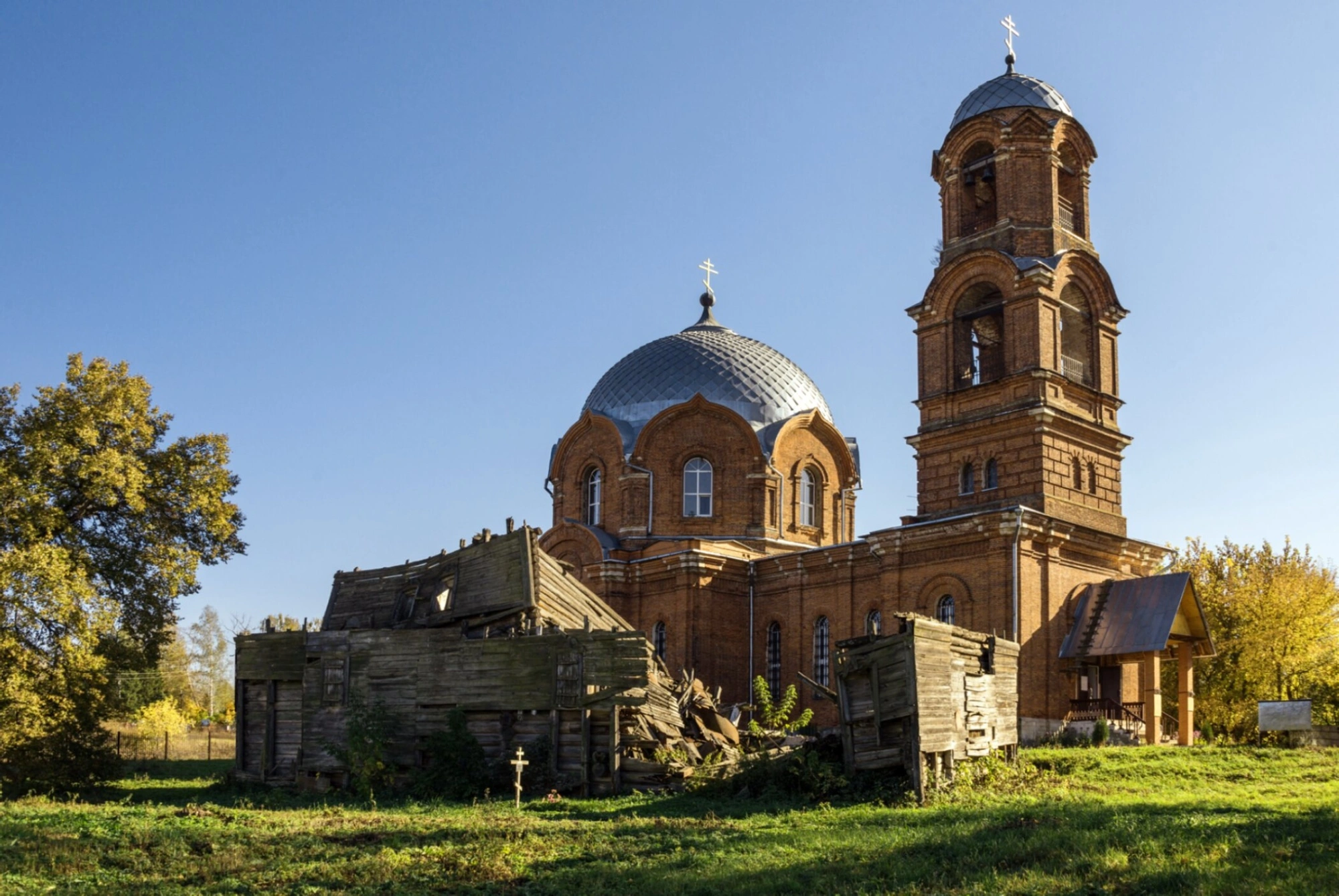 Архитектурный облик храма складывается из четверика основного объёма, увенчанного луковичной главой на световом барабане, и трёхъярусной колокольни, завершённой шпилем. Фасады украшены кирпичным декором, характерным для периода строительства. На переднем плане фотографии виднеются остатки исторических деревянных построек, вероятно, относящихся к церковному причту или приходским сооружениям.