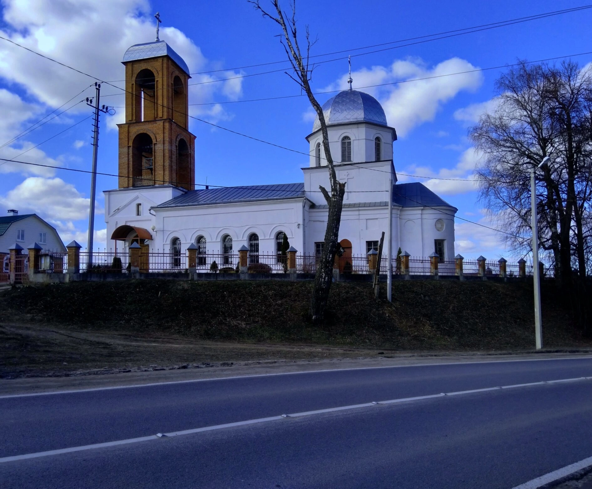 Фотография передаёт величие и строгую красоту этого духовного памятника. Белоснежные стены храма символизируют чистоту и святость, а тёмная кровля куполов создаёт благоговейный и строгий образ. Церковь является не только архитектурной доминантой села, но и его духовным сердцем, напоминая о вечных ценностях и непреходящей красоте православной веры.