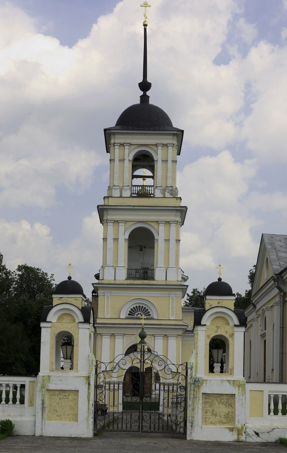 На снимке хорошо просматривается архитектурный ансамбль храма, доминантой которого является высокая колокольня, увенчанная изящным куполом со шпилем. Колокольня выполнена в традициях русской церковной архитектуры и составляет гармоничное единство с основным объёмом храма. Фасад здания отличается строгостью форм и благородной цветовой гаммой, характерной для православных храмов Подмосковья.