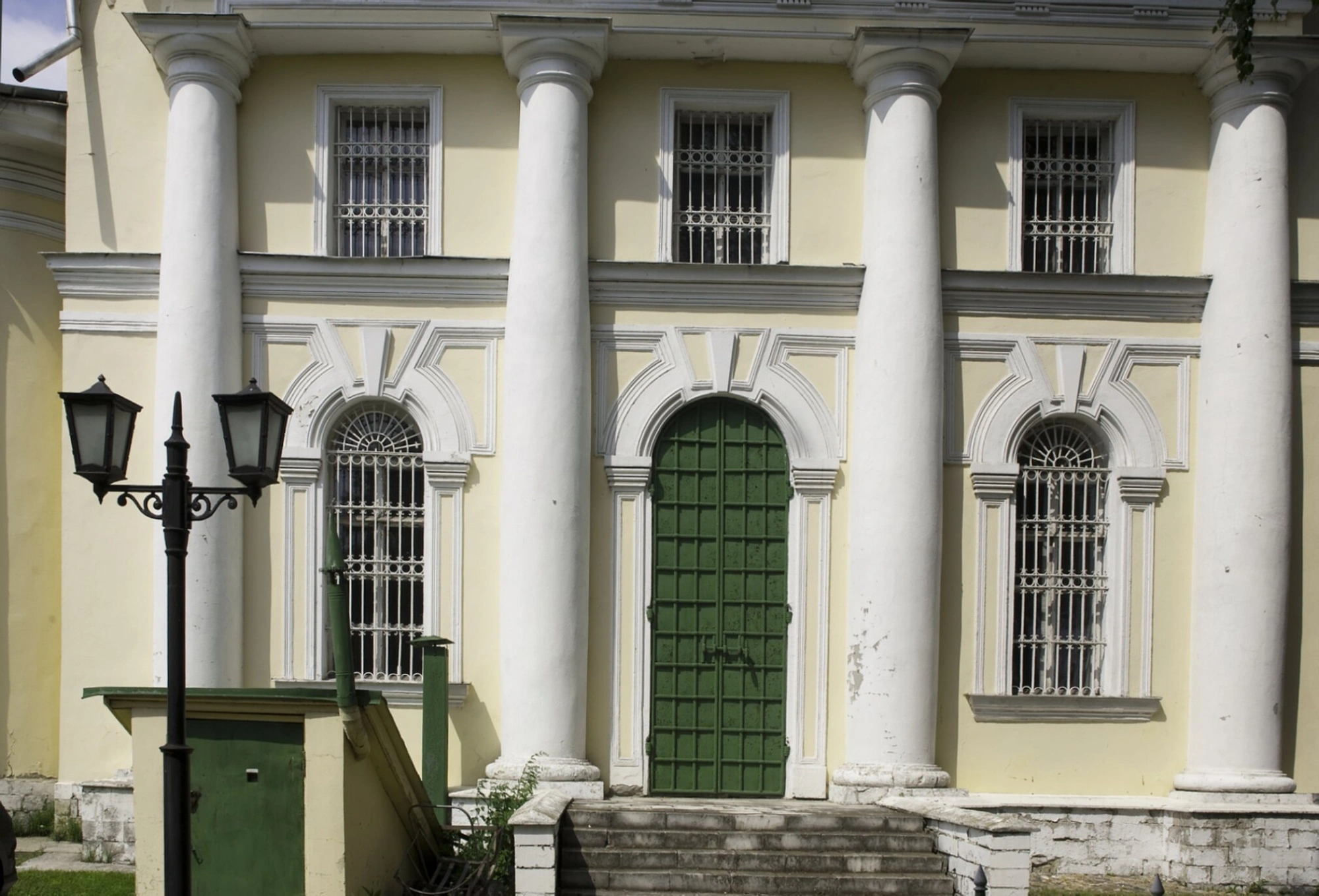 Главный фасад храма украшает монументальный портик, который поддерживают четыре белоснежные колонны с выразительными капителями. Эти колонны не только придают зданию торжественный и строгий вид, но и символизируют твёрдость веры и незыблемость православных устоев. К центральному входу ведёт каменная лестница, приглашая верующих переступить порог дома Божьего.