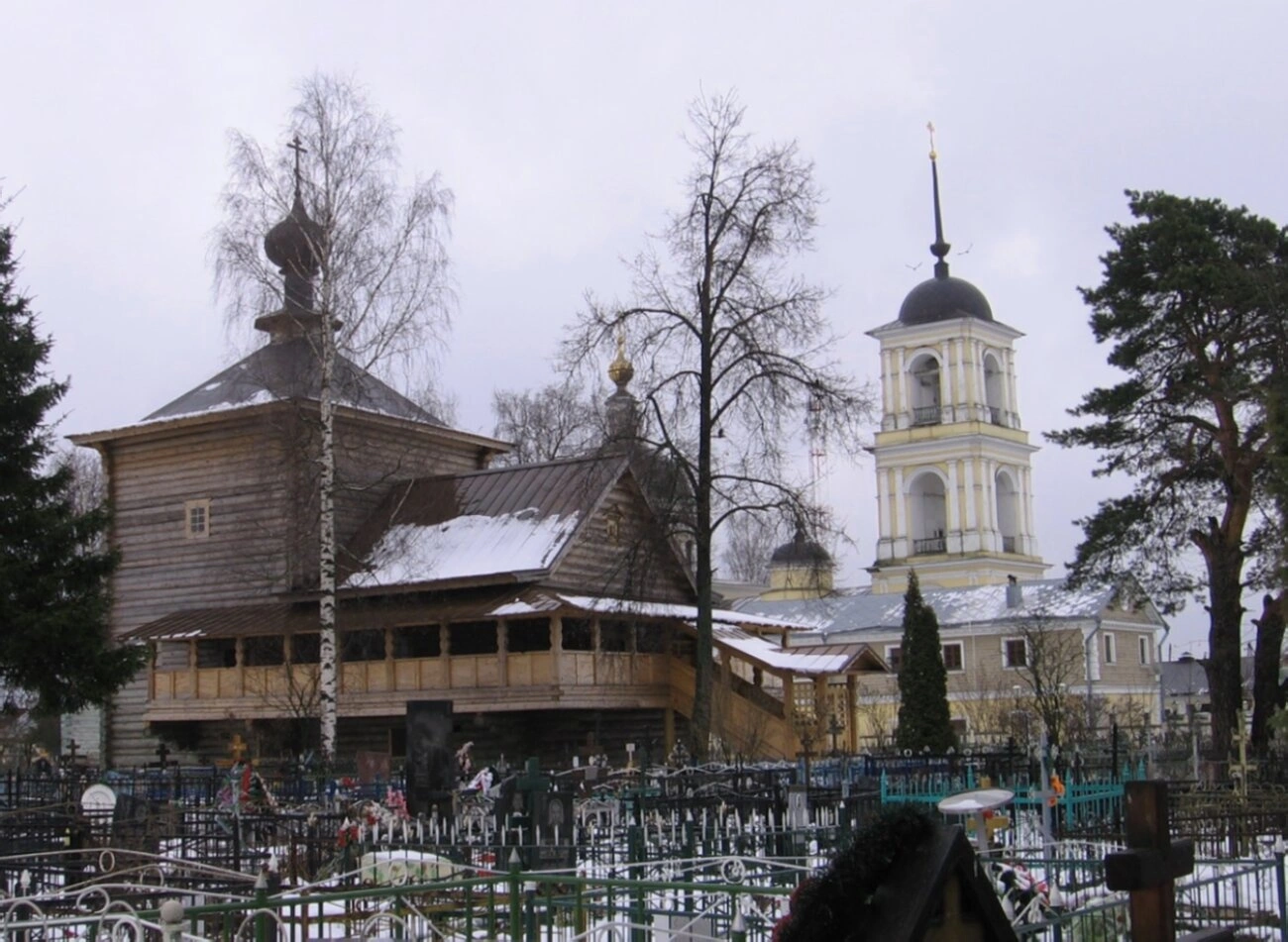 На представленной фотографии запечатлен храмовый комплекс Покрова Пресвятой Богородицы, расположенный в селе Воскресенское Ногинского района. Архитектурный ансамбль, изображенный в зимнее время, включает в себя деревянную церковь, каменную колокольню и окружающую территорию приходского кладбища. Деревянный храм Покрова Пресвятой Богородицы, являющийся центром композиции, представляет собой одноглавую церковь, характерную для русского церковного зодчества. Первое упоминание о церкви на этом месте относится к 1626 году. Исторический храм сгорел в 1705 году и был впоследствии отстроен заново, сохранив традиционные архитектурные формы. Рядом с деревянной церковью возвышается каменная колокольня, сооруженная в более поздний период. Ее ярусное строение и завершение в виде купола со шпилем создают гармоничный контраст с рублеными стенами основного храма. На переднем плане фотографии видна территория кладбища с многочисленными крестами и надгробиями, покрытыми снежным покровом. Окружающий пейзаж с деревьями, часть из которых лишена листвы, а хвойные сохраняют зеленый цвет, подчеркивает время года и создает особую молитвенную атмосферу этого святого места.