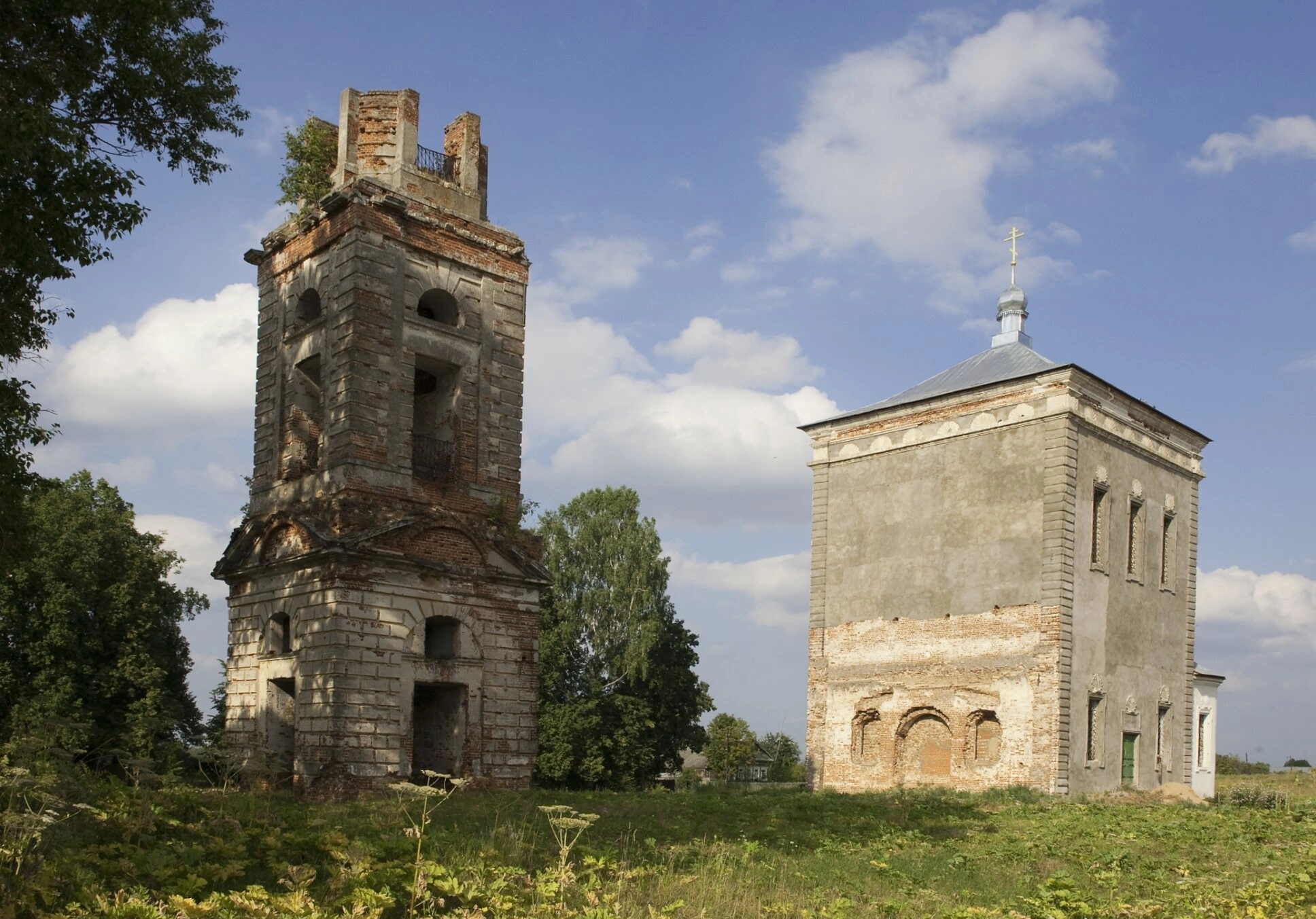 Снимок наглядно свидетельствует о сложной истории святыни. В 1936 году безбожные власти закрыли храм, после чего он был разграблен. Трапезная часть была полностью уничтожена, а на её месте проложили дорогу. Колокольня, изображенная на фотографии, лишилась своего завершения, но в её интерьерах чудом сохранились фрагменты старинных росписей, включая изображения святителей Московских и евангельских сюжетов.
