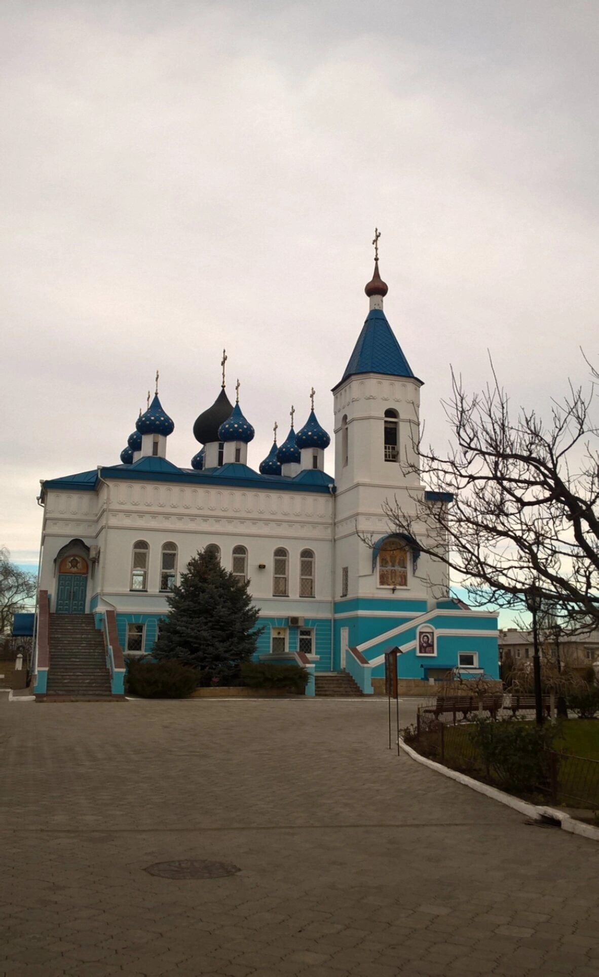 Главы храма, увенчанные золочёными восьмиконечными крестами, горят на солнце, устремляясь в небесную высь. Их синее покрытие, усыпанное звёздами, напоминает о небесной славе Пресвятой Богородицы, покровом Своим защищающей верующих. Снимок сделан в безлиственный период, что позволяет в деталях рассмотреть благородную строгость архитектурных линий и изящество декоративных элементов.