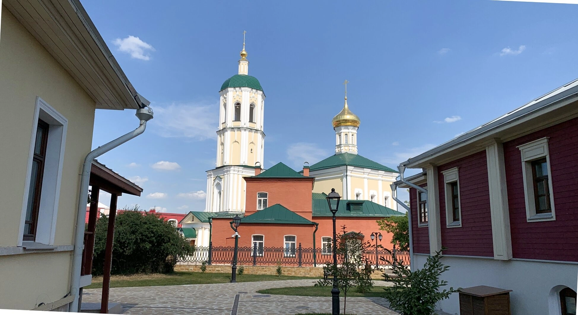 Фотография передает благолепие восстановленного храмового комплекса, который является не только местом молитвы, но и важным памятником истории и культуры Тулы, свидетельствующим о торжестве Православия над временем и земными испытаниями.