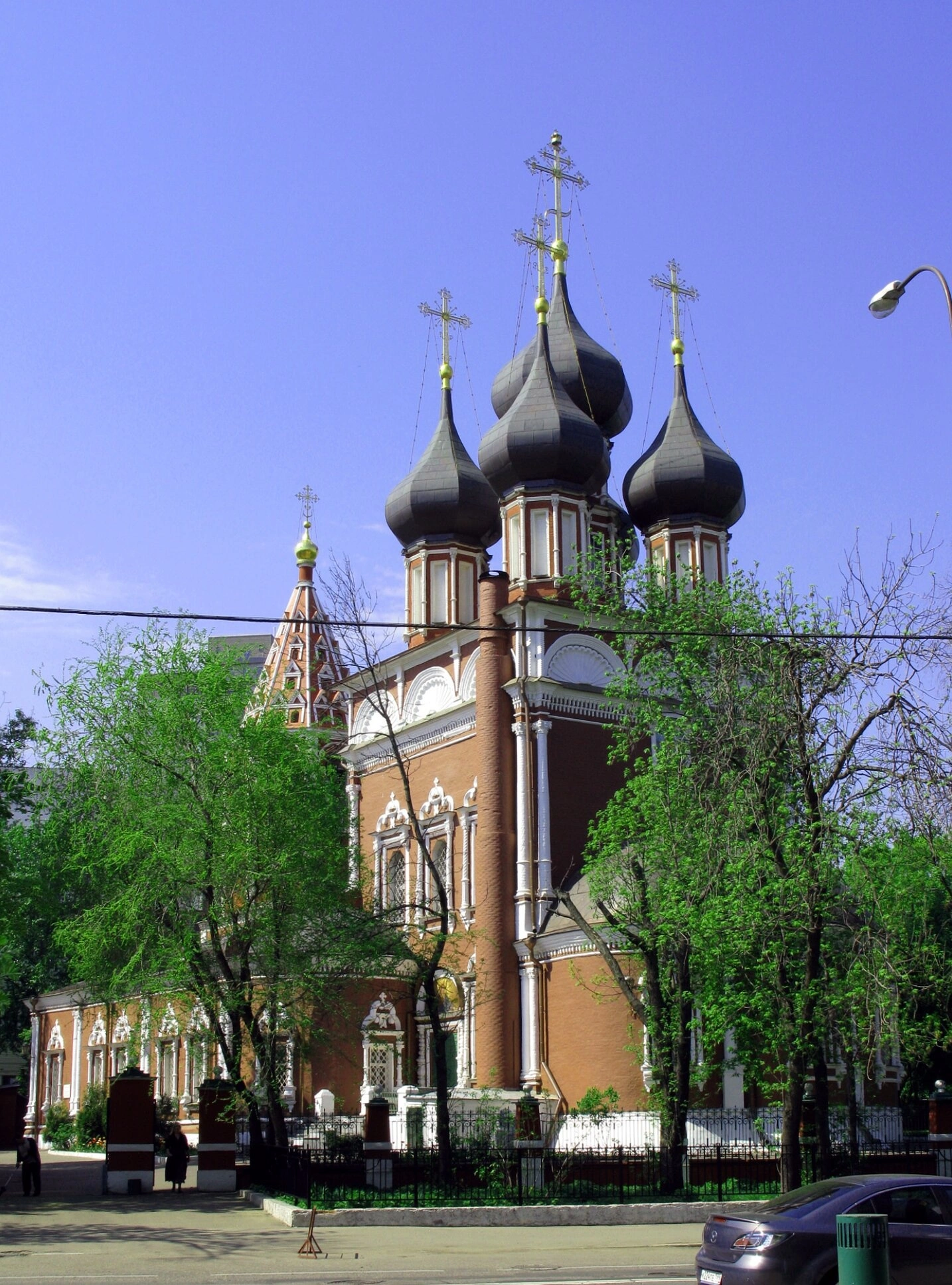 На фотографии запечатлён храм Положения Ризы Пресвятой Богородицы во Влахерне, что на Донской улице в Москве. Этот православный храм является выдающимся памятником церковной архитектуры и объектом культурного наследия народов России.