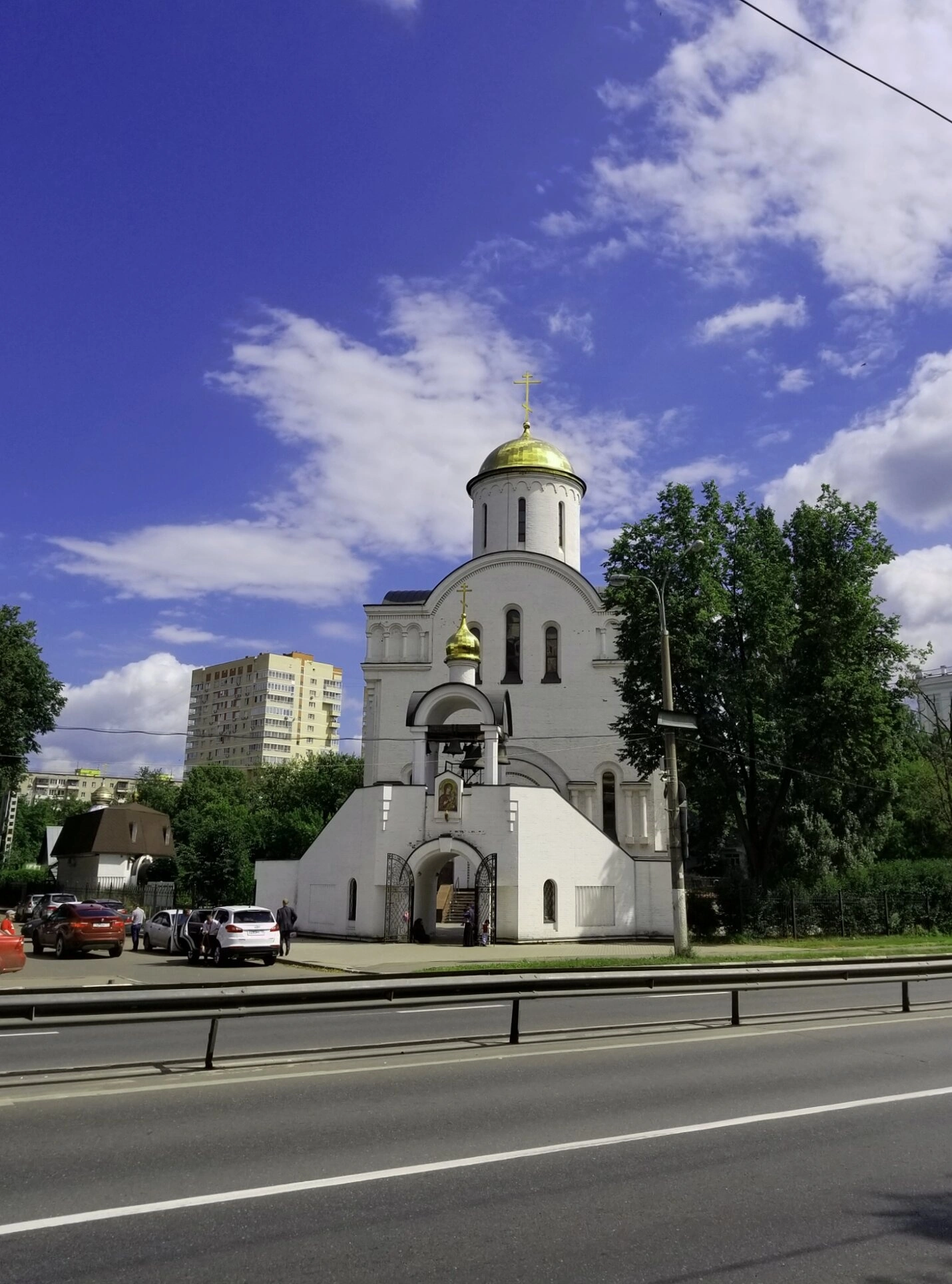 На представленной фотографии запечатлён воссозданный храм Преображения Господня, расположенный на исторической Преображенской площади в Москве. Светлое здание с золочёным куполом и крестом величественно возвышается в окружении современного городского пейзажа, символизируя торжество веры и непрерывность традиций.